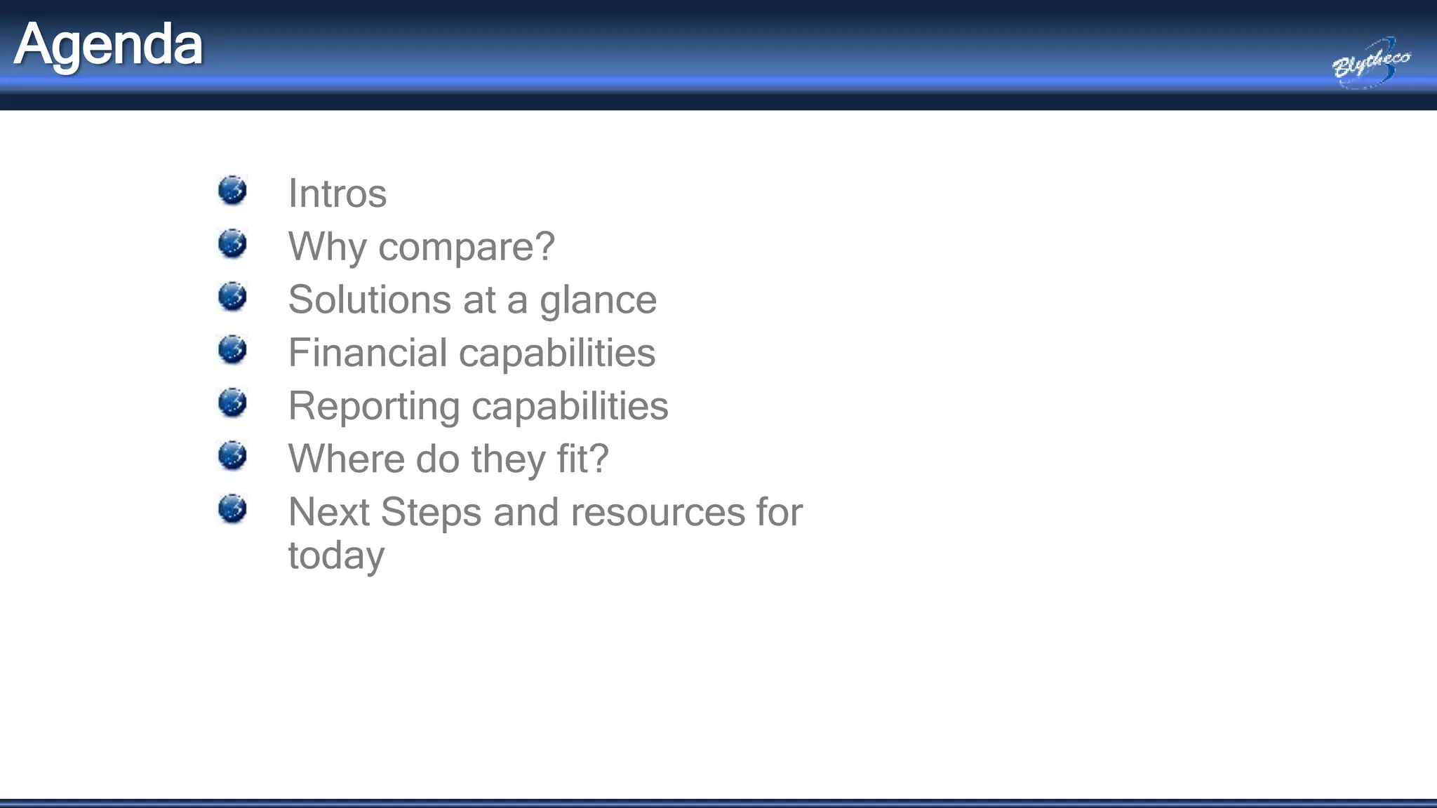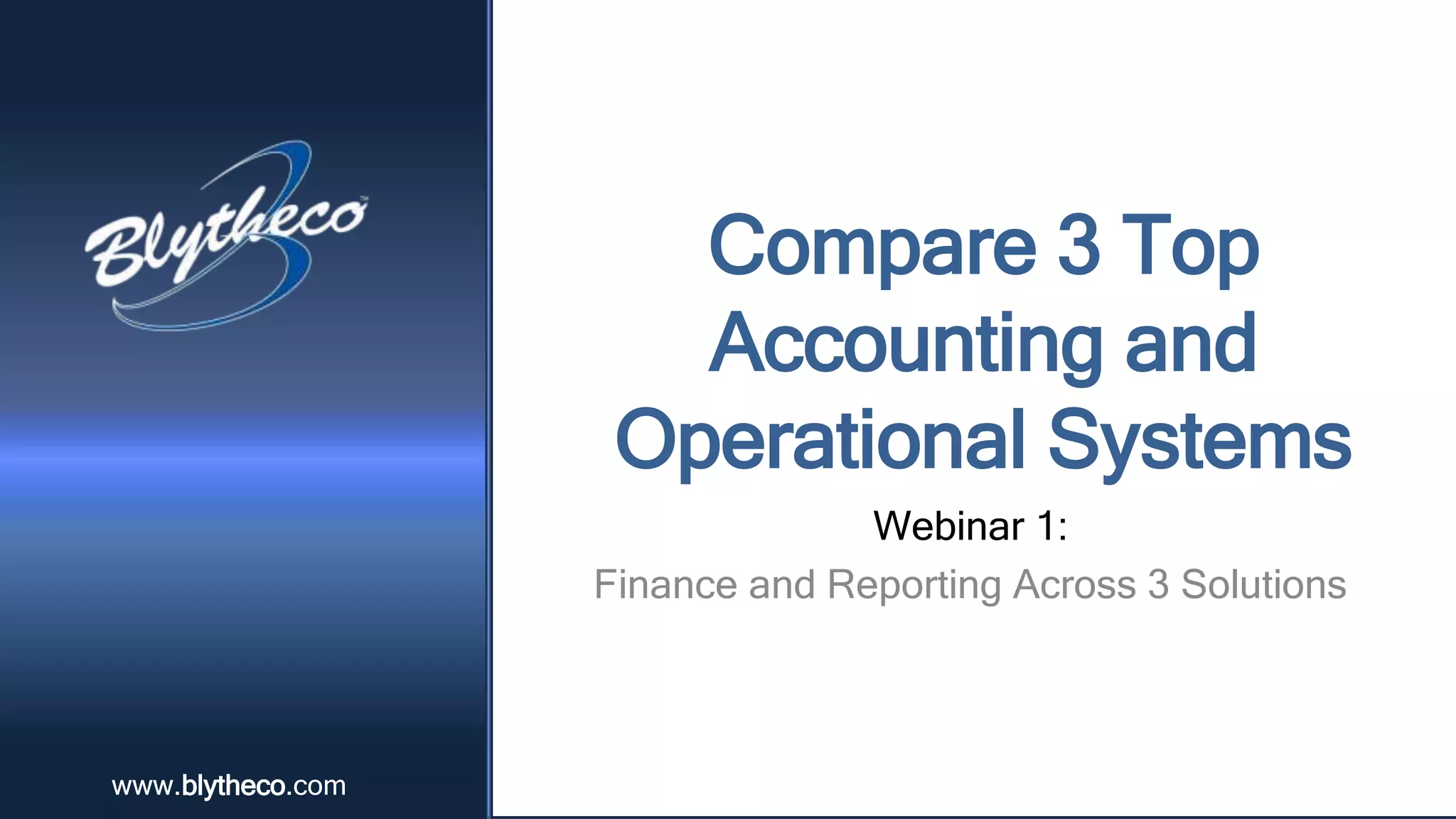 The document outlines a webinar comparing three accounting and operational systems: Sage 100, MS Dynamics GP, and QuickBooks. It discusses their financial and reporting capabilities, security features, tax filing options, workflows, and support services, highlighting that they all have similar capabilities but differ in fit for specific business needs. It emphasizes the importance of choosing the right solution based on the unique requirements of a business and encourages attendees to sign up for additional sessions on distribution and manufacturing capabilities.