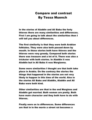 The document compares and contrasts the folktales of Aladdin and Ali Baba and the Forty Thieves. It outlines several similarities between the stories, such as them both being Arabian folktales passed down orally that involve thieves, treasure, and a trickster character. Differences discussed include Aladdin involving a street rat becoming a prince and magic elements like a genie and talking bird, while Ali Baba focuses on using a password to access a thieves' cave. In the end, the document concludes that while both stories have similarities and differences, the author slightly prefers Ali Baba since it was newly discovered to them.