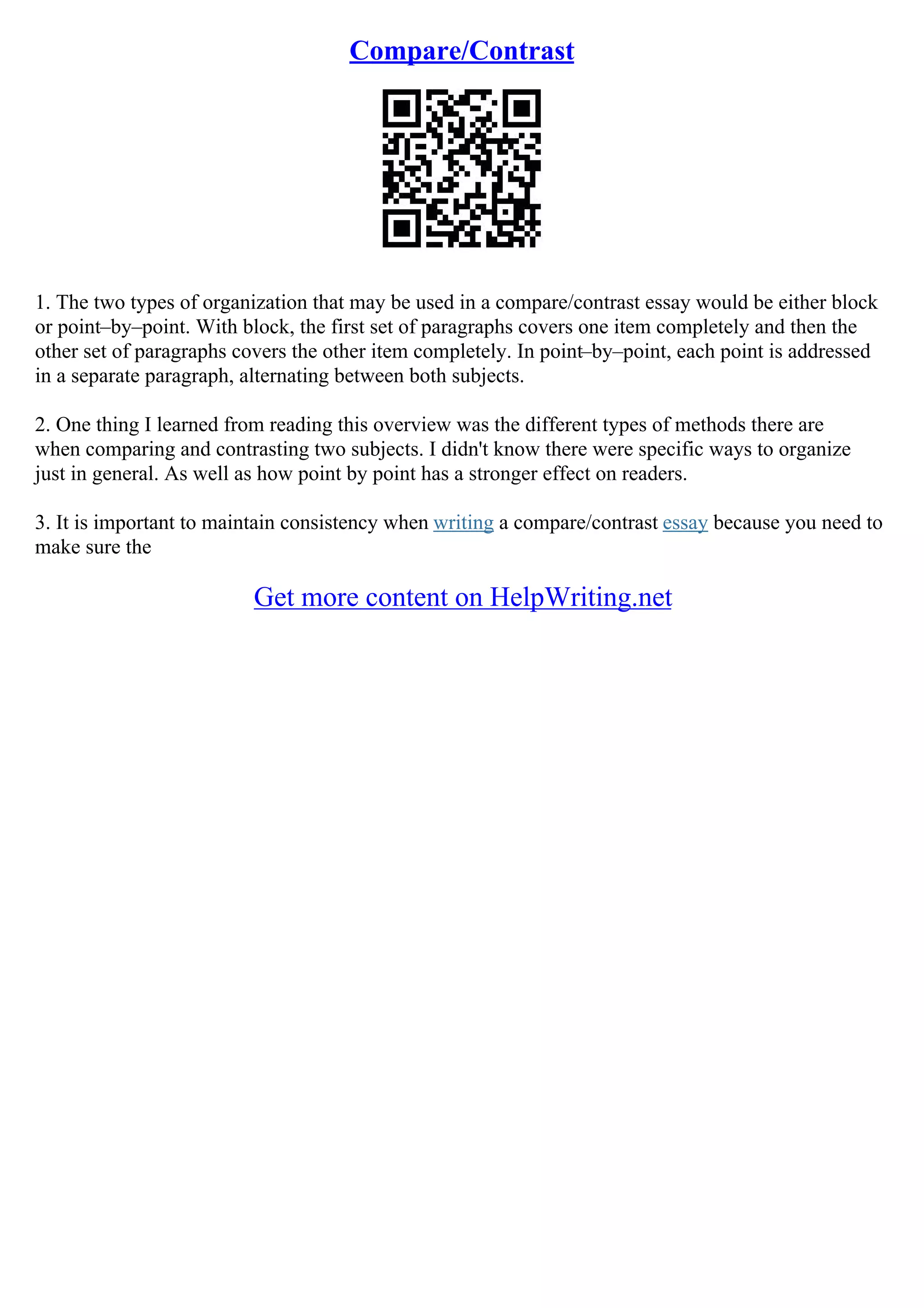 This document discusses the organization of compare/contrast essays, highlighting two methods: block and point-by-point. It explores themes in literature, particularly focusing on the portrayal of confinement in marriage in works by Kate Chopin and Charlotte Gilman, as well as analyzing symbolism in Shirley Jackson's 'The Lottery.' The document emphasizes the importance of organization in essays and how contrasting subjects can provide deeper insights.