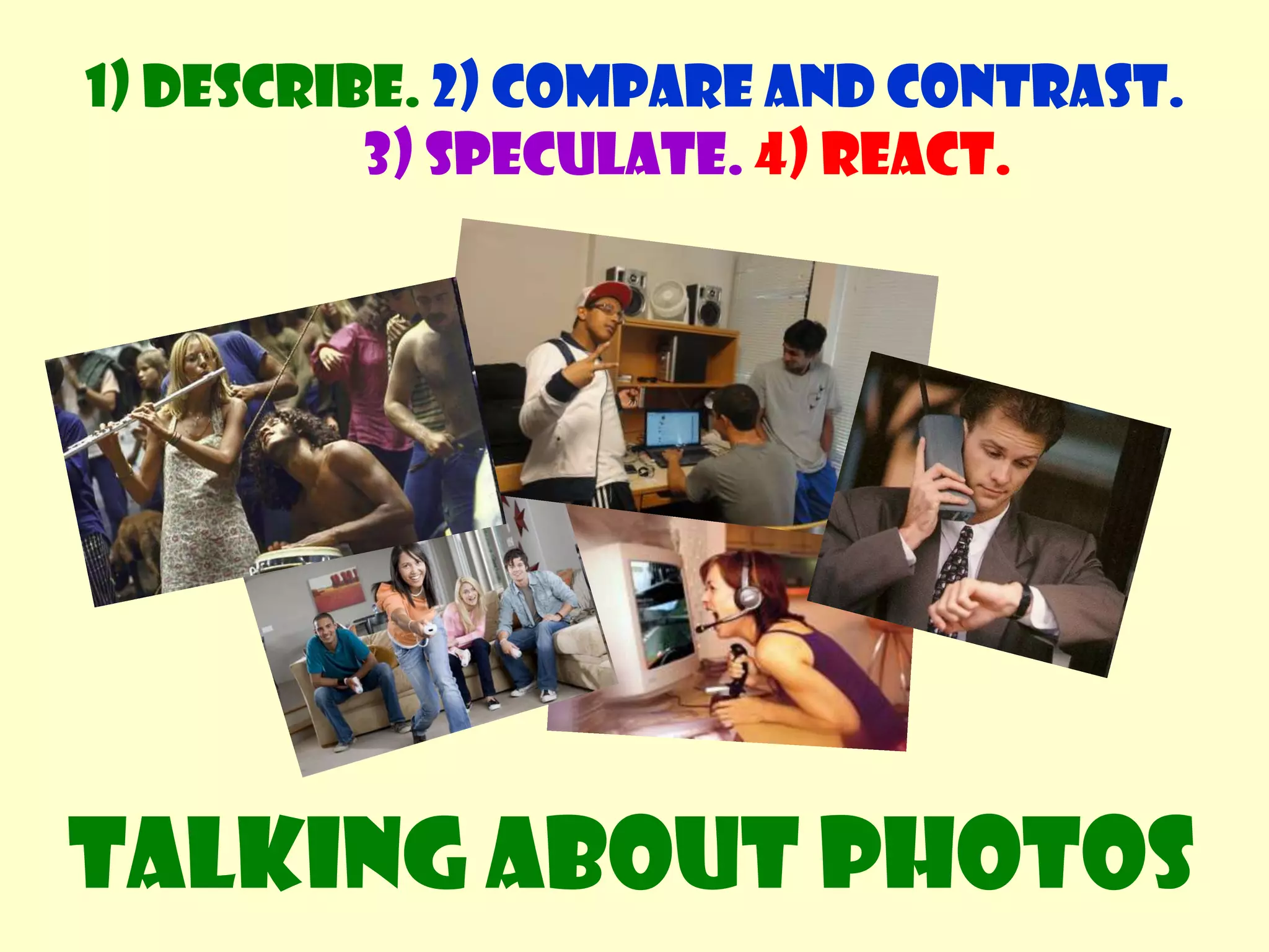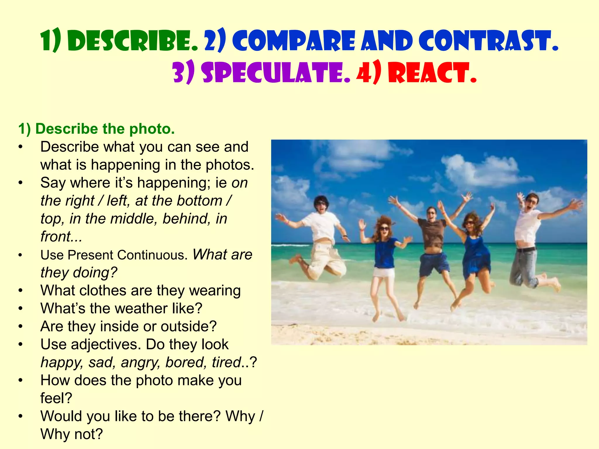 The document provides a structured approach to discussing photos, emphasizing the importance of description, comparison, speculation, and personal reaction. It outlines the vocabulary and sentence structures used for each part of the analysis, such as identifying similarities and differences in photos. The guidance encourages the use of present continuous and emotive language to enhance the descriptive quality of the discussion.