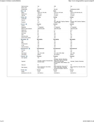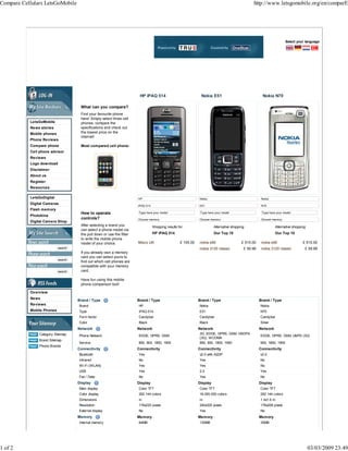This document compares the specifications of three mobile phones: the HP iPAQ 514, Nokia E51, and Nokia N70. It provides a table that lists details such as screen size, memory capacity, battery life, connectivity features, and dimensions for each phone. Users can select any three phones to view their key specs side by side for easy comparison. The tool aims to help users find their favorite phone and check the lowest available price online.