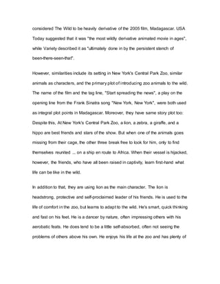 This document compares and contrasts the animated films Madagascar and The Wild. Both films have similar plots where zoo animals from New York City end up stranded in the wild. Specifically, the main characters in both are lions who lead their friends, which also include a zebra, giraffe, and hippo. Both films also share similarities in their setting in Central Park Zoo, use of animals as characters, and the plot of introducing domesticated zoo animals to the wilderness. However, some critics argue The Wild is a blatant rip-off of Madagascar while others believe it is the superior film. Overall, the document analyzes the many similarities and few key differences between these two animated films with nearly identical storylines and