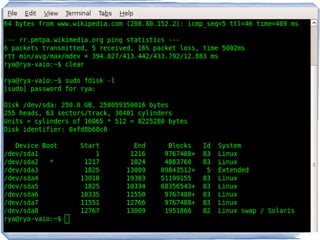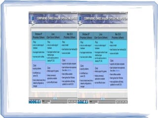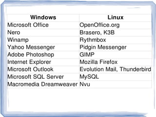 This document discusses the key differences between Windows and Linux operating systems. It covers aspects like cost, installation, hardware requirements, security, bugs, and supported software. It also provides an overview of popular Linux distributions like Debian, Ubuntu, Fedora, and describes various Linux certifications. The document aims to educate people about open source operating systems and their advantages compared to proprietary systems like Windows.