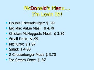 1) The document discusses ordering decimals from least to greatest using place value and number lines. It provides examples of ordering prices from a McDonald's menu and test scores.