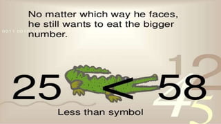 This document discusses comparing and ordering numbers. It explains that to compare numbers, they should be lined up based on their place value and the digits compared from left to right. The number with the greater value in the highest place is considered larger. It provides examples of comparing standard numeric values as well as word forms of numbers to standard forms. Multiple choice questions are also included to test ordering three numbers from least to greatest.