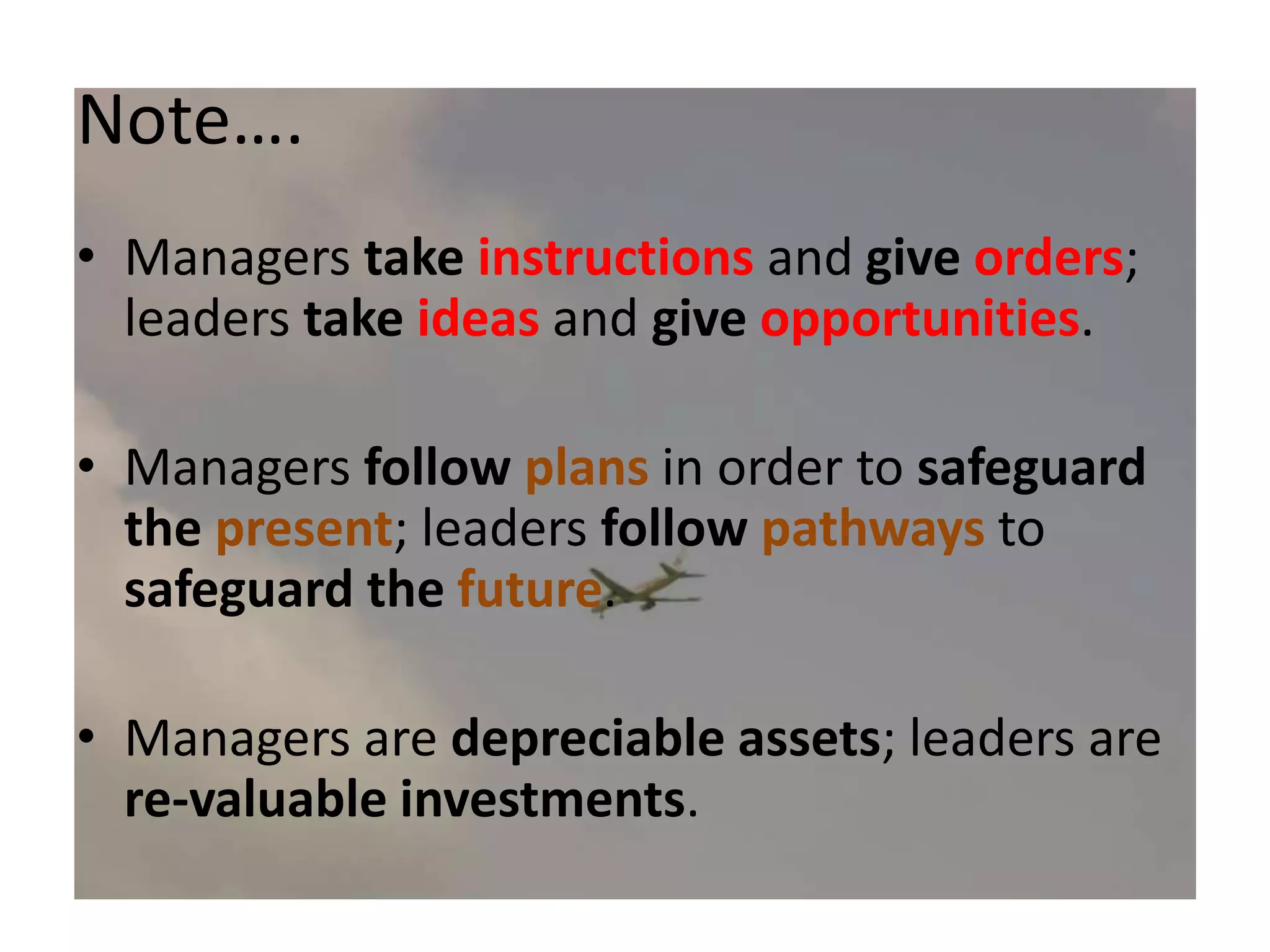 Managers focus on following instructions and plans to maintain the current situation, while leaders take new ideas and provide opportunities to shape the future. Managers are replaceable assets, whereas leaders are valuable long-term investments. Leaders look ahead to safeguard the future by exploring new pathways, instead of just focusing on maintaining the present like managers do.