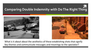 The document compares the use of cinematography and mise-en-scene in Double Indemnity and Do The Right Thing. It discusses how techniques like wide shots, high and low angles, lighting, and expansive frames are used to define characters and communicate themes through barriers and entrapment. For Do The Right Thing specifically, Spike Lee employs canted angles and wide angle close ups to signify underlying social tensions and disruption.