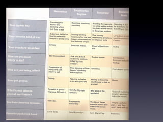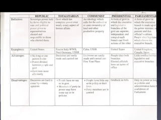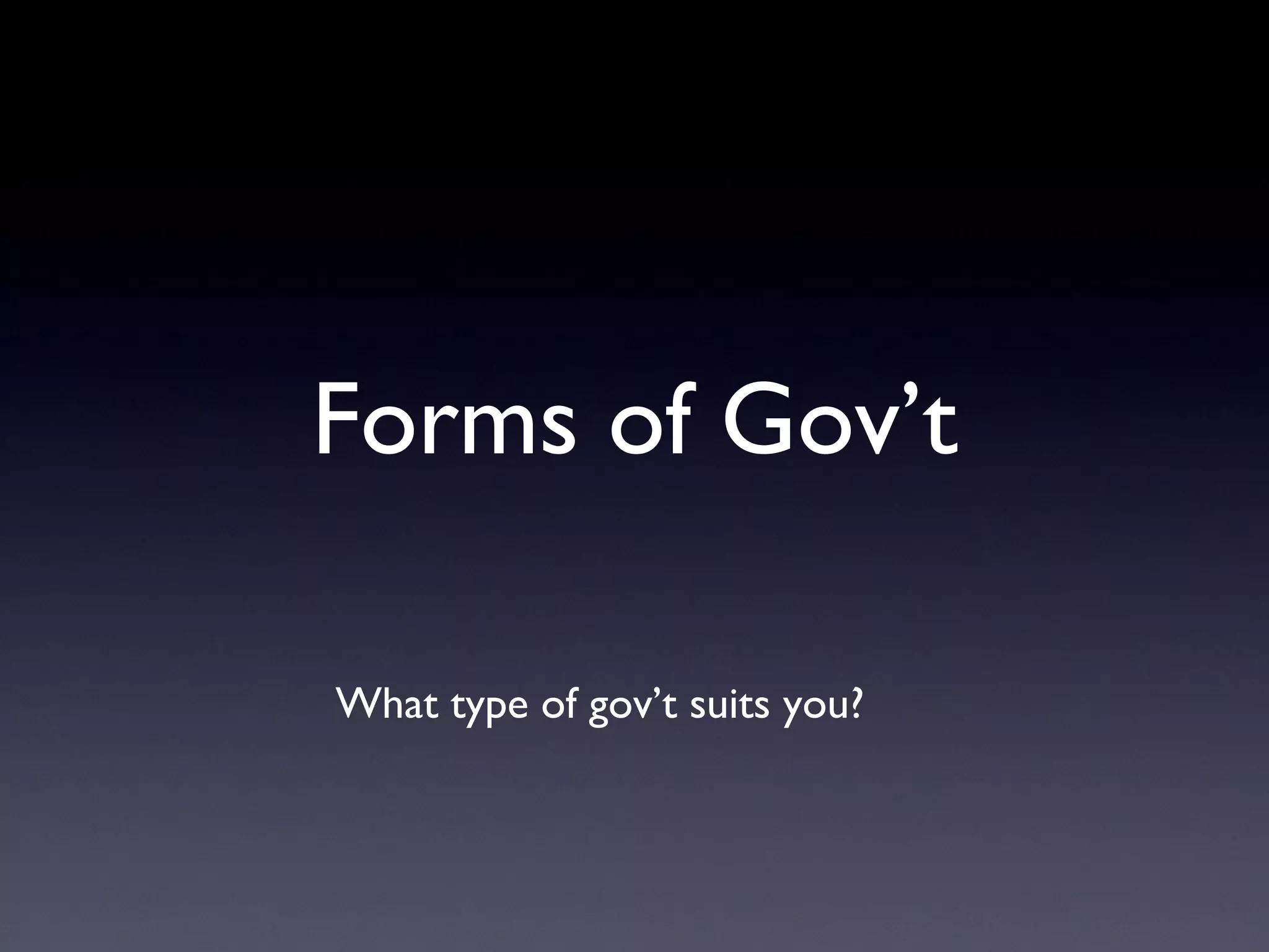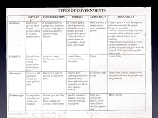 The document discusses different forms of government and assigns students group activities to learn about them. Students are asked to look at a chart in their textbook about types of governments and then work in assigned groups to prepare a skit representing one form. As homework, students must define and provide an example and drawing for each of ten types of governments.