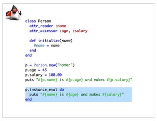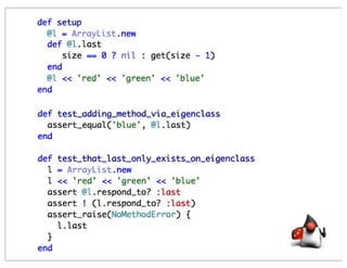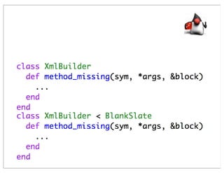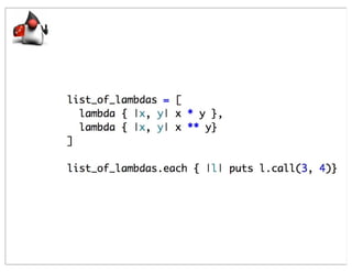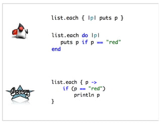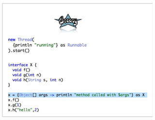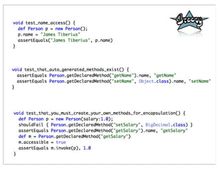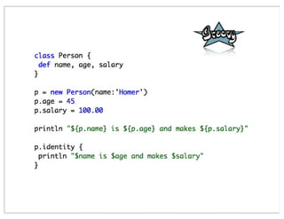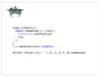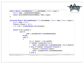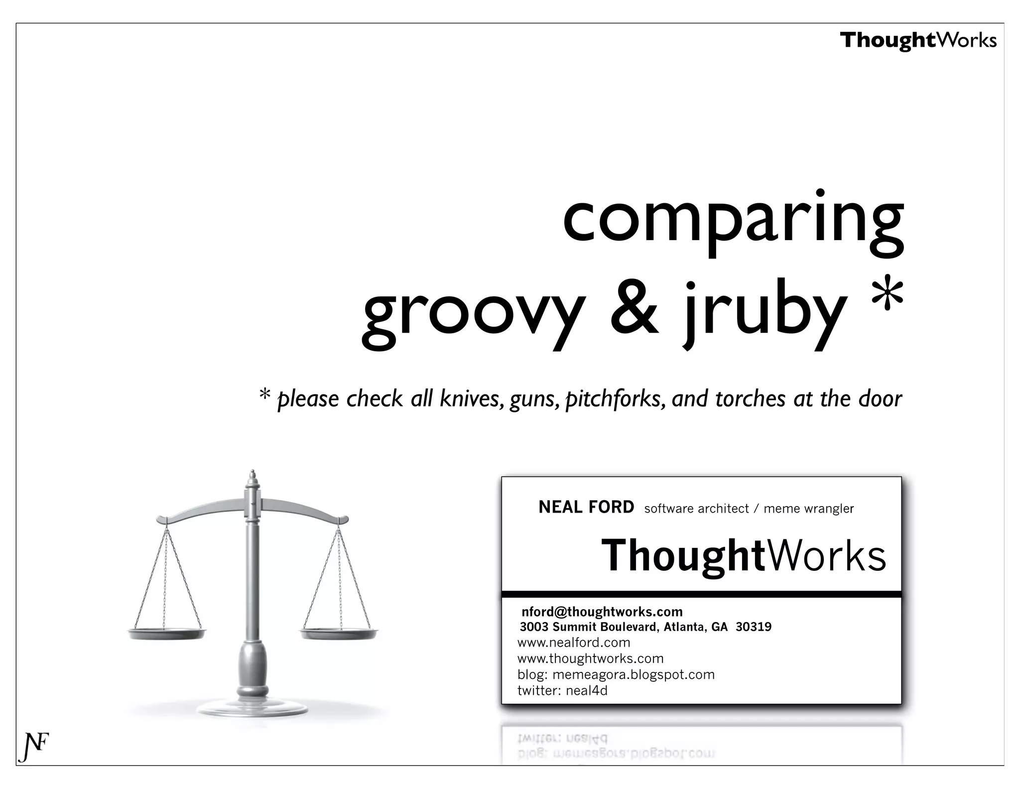 This document summarizes a presentation comparing Groovy and JRuby. Groovy dynamicizes the Java platform by adding dynamic language features to Java, while JRuby brings Ruby to the Java platform. Both languages add objects to support collections and other features, but implement meta-programming and other techniques differently. Groovy encapsulates and extends existing Java frameworks, while Ruby tends to build abstraction layers using meta-programming and DSLs. Both languages have advantages and disadvantages for unparalleled Java integration versus being cross-platform.