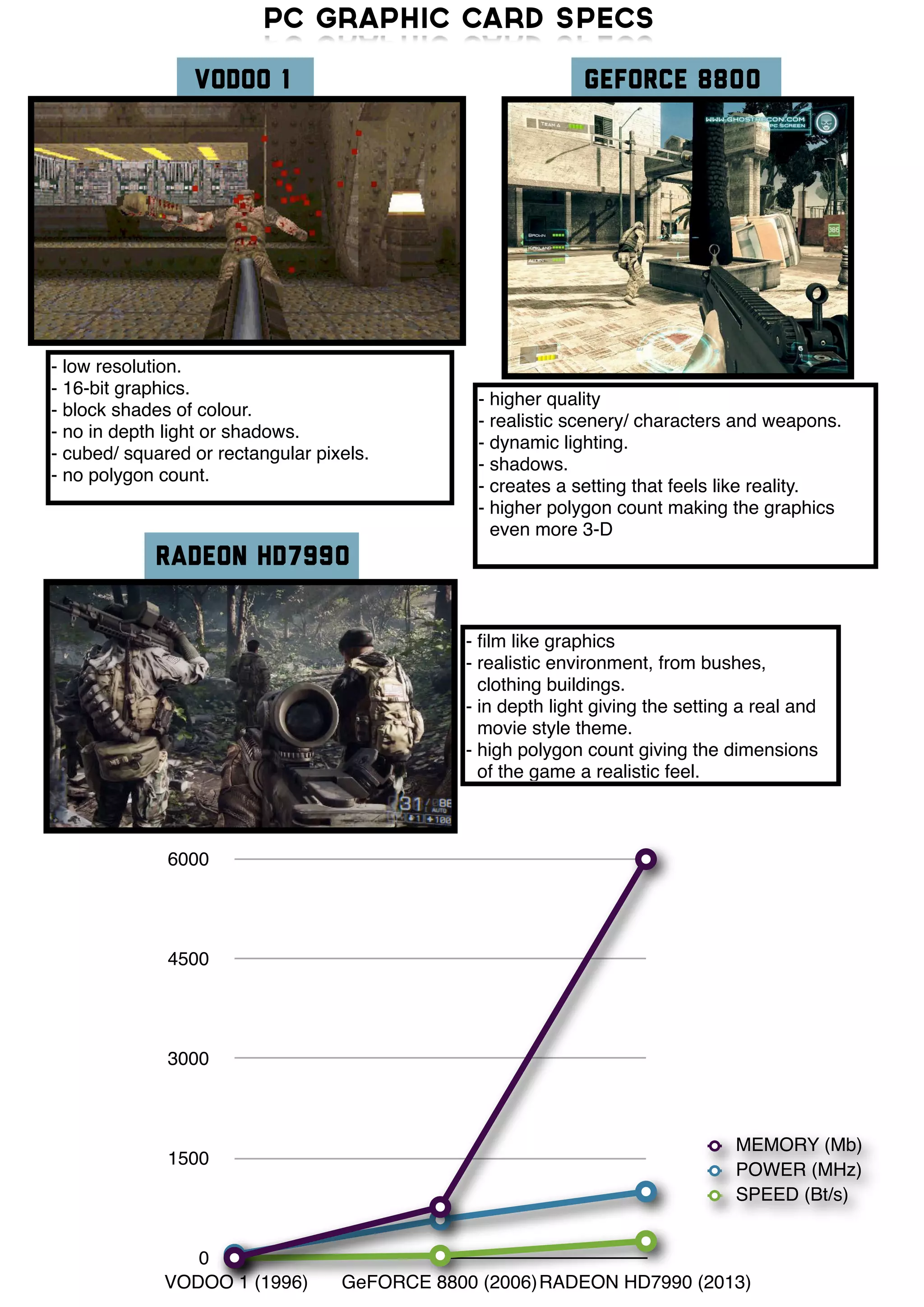 This document compares the specifications and graphics capabilities of early PC graphics cards like the Voodoo 1 from 1996 to more advanced cards like the GeForce 8800 from 2006 and Radeon HD7990 from 2013. Early cards had low resolutions, blocky colors, and no lighting or shadows while more recent cards provide higher quality graphics with realistic lighting, shadows, and environments that feel almost like reality due to higher polygon counts and more detailed 3D graphics.