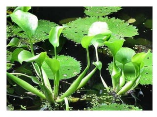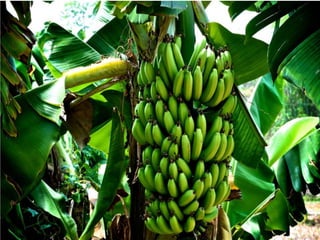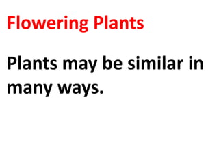 The document discusses different types of plants including flowering and non-flowering plants. It describes key parts of plants like roots, stems, leaves, flowers and fruits. Roots are described as primary, fleshy, fibrous or aerial. Stems can be hard, woody, soft, hollow or creeping vines. Leaves have blades that can be different shapes and sizes. Flowers come in various colors, scents and sizes. Fruits contain different numbers of seeds and examples are given of plants that bear fruits or seeds.