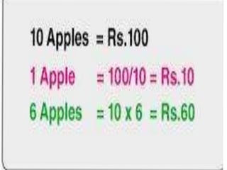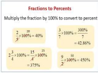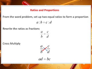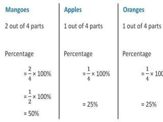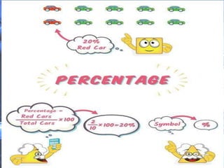 The document discusses various methods for comparing quantities using ratios, percentages, and proportions. It explains how to calculate and convert between ratios, equivalent ratios, percentages, fractions, decimals, and more. It also covers topics like simple interest, profit/loss percentages, cost price vs. selling price, and how to calculate amounts if certain variables are given.