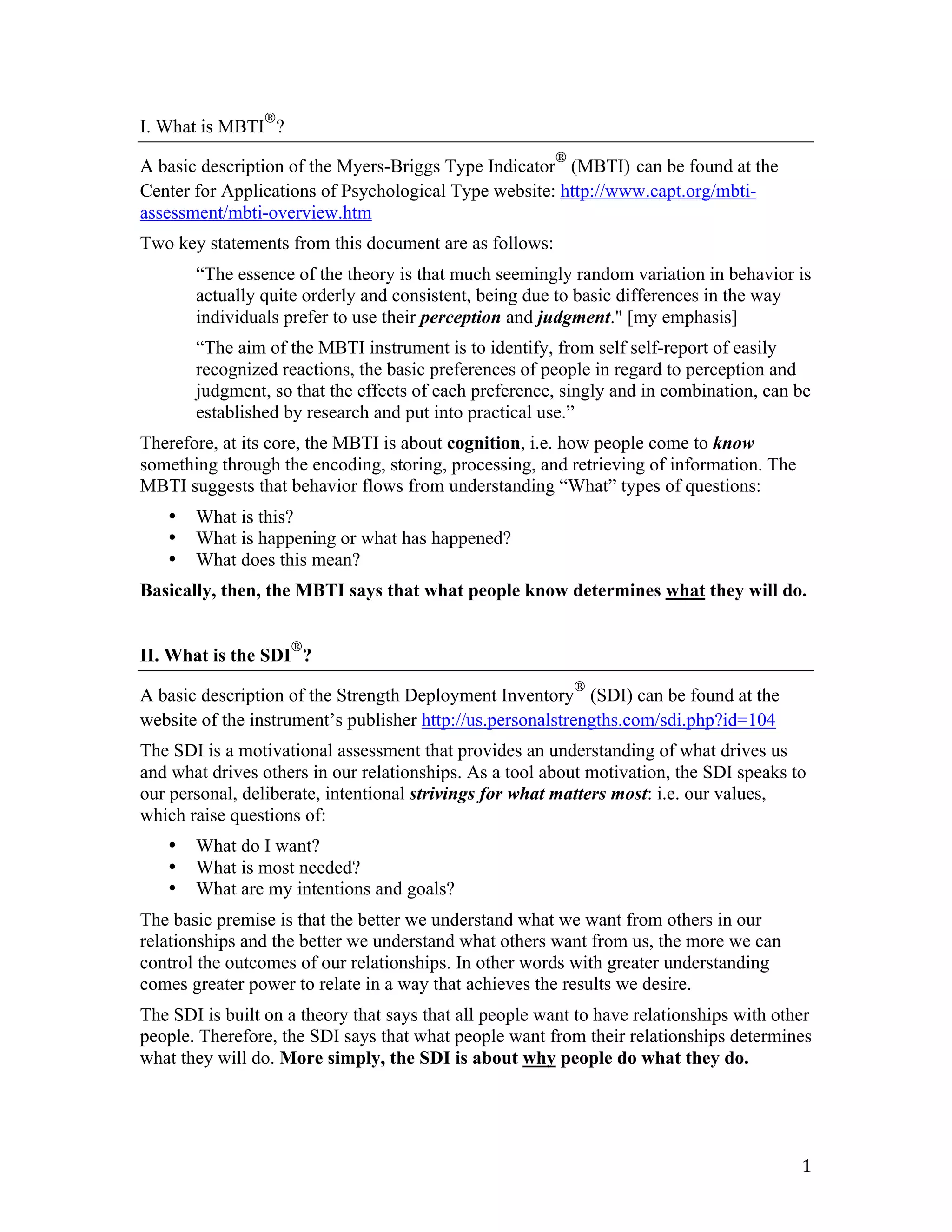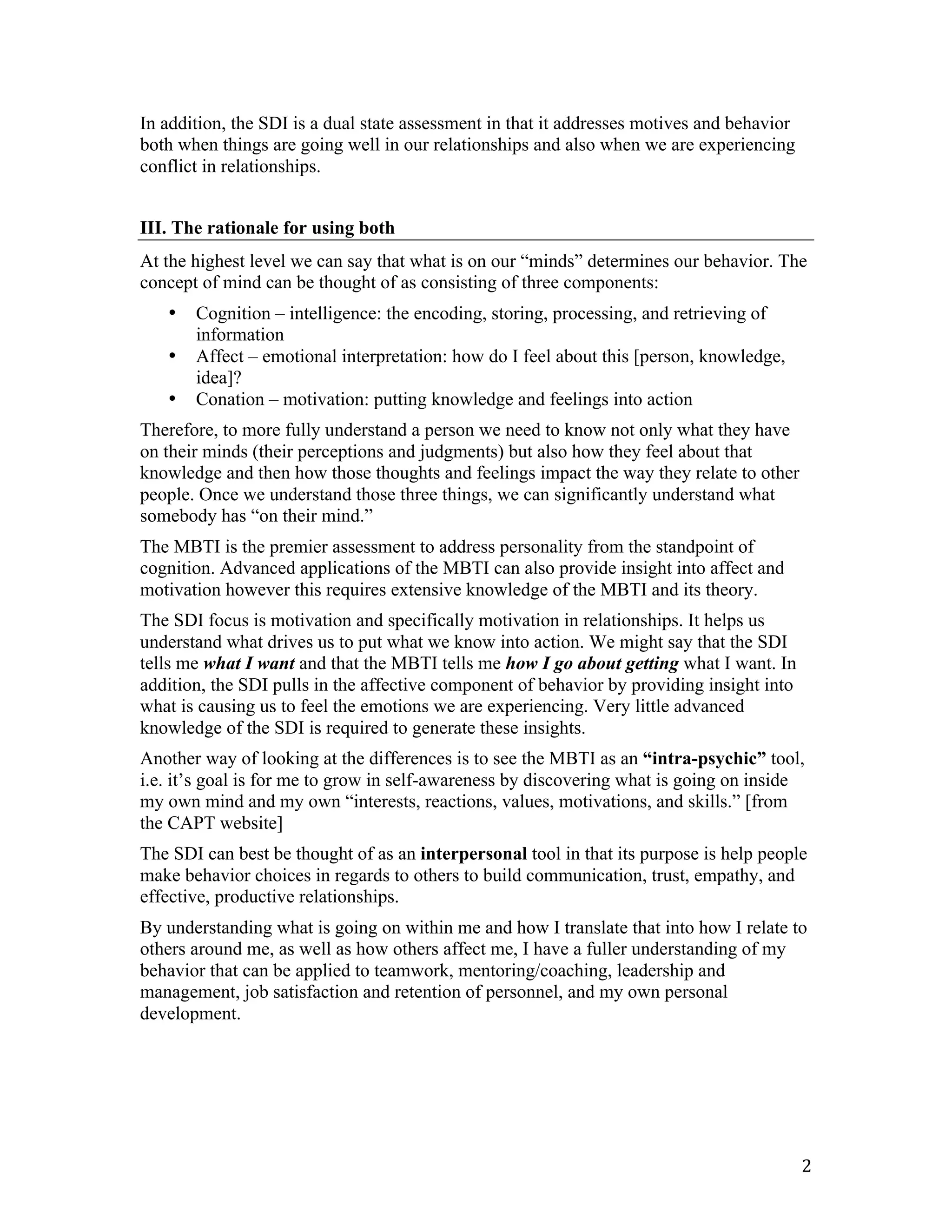The document discusses the Myers-Briggs Type Indicator (MBTI) and the Strength Deployment Inventory (SDI). The MBTI focuses on cognition and how people process information to determine behavior preferences. The SDI focuses on motivation and what drives behavior in relationships. Using both assessments provides a more holistic understanding of individuals by examining cognition, affect, and motivation. The MBTI is best for understanding information processing and task-related behavior, while the SDI shines light on relationship dynamics, values, and communication styles. Together they provide complementary insights to support areas like team building, leadership development, and change management.