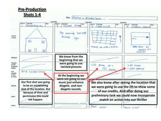 1) The document discusses the pre-production and post-production planning for shots in a thriller film. It outlines initial ideas, changes made during filming due to limitations, and further changes during editing.