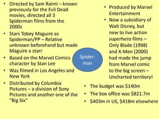 Edgar Wright's 2010 film Scott Pilgrim vs. The World was based on Bryan Lee O'Malley's graphic novel series. It had a budget of $60 million but only grossed $47.7 million worldwide. Starring Michael Cera as Scott Pilgrim, the film was produced by British company Big Talk Productions and distributed by Universal Pictures. Sam Raimi's 2002 film Spider-Man starred Tobey Maguire as Peter Parker/Spider-Man and was produced by Marvel Entertainment and distributed by Sony Pictures. With a $140 million budget, it grossed $821.7 million worldwide. Christopher Nolan's 2005 film Batman Begins rebooted the Batman franchise starring Christian Bale.