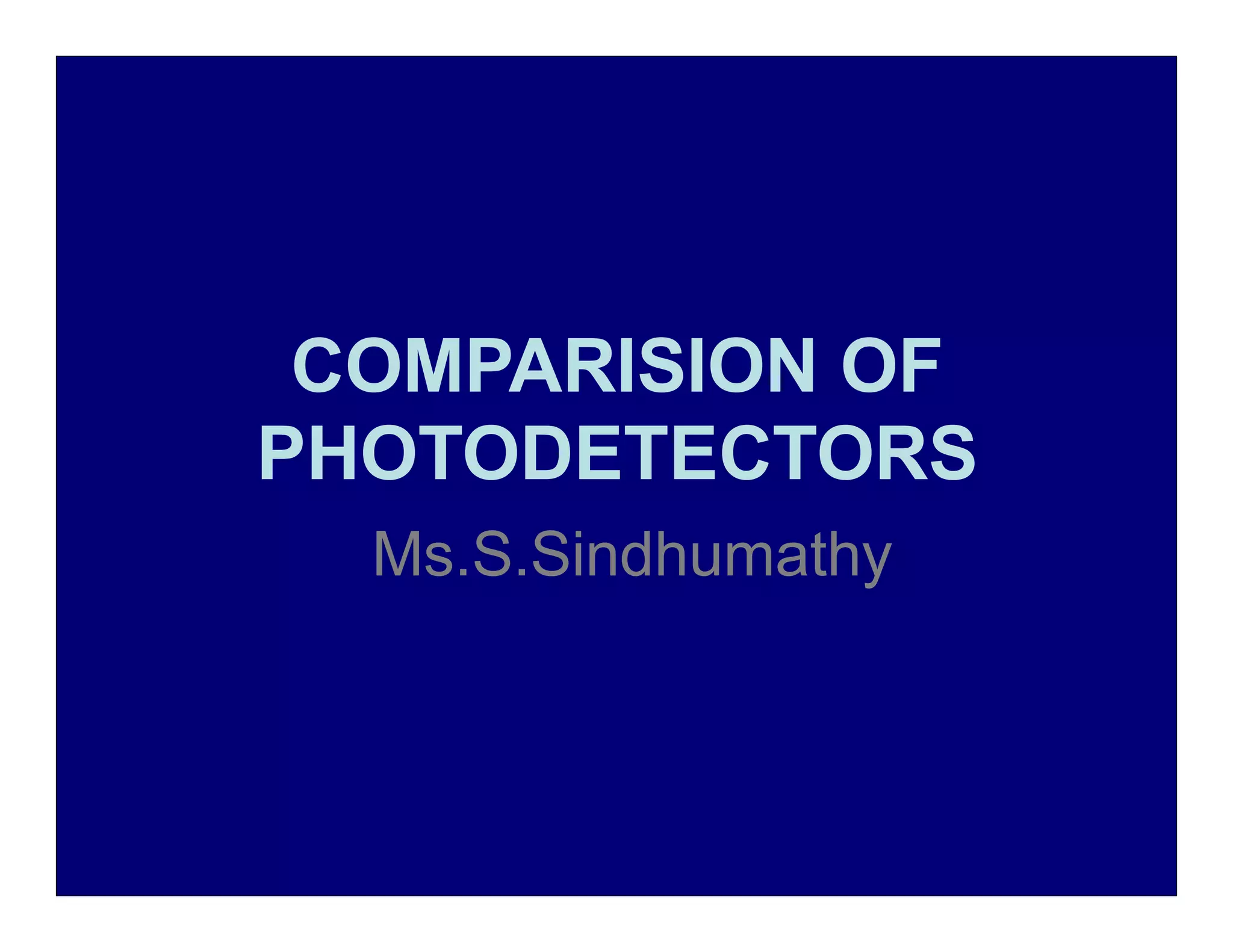 The document compares different types of photodetectors. It discusses how photodetectors work by converting light into an electrical signal through generating electron-hole pairs. It classifies photodetectors as either semiconductor-based, which generate electron-hole pairs when exposed to light, or photoemissive, which use the photoelectric effect. Common semiconductor photodetectors include photodiodes, phototransistors, and photoresistors. The document also covers important properties, materials, and operating mechanisms of various photodetector types.