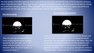 The filmmakers originally named their production company "Moonlight Studios" but found it difficult to space the words on either side of the moon logo. They changed the name to "Moon Studios" which fit better visually by spacing the words more evenly and including the missing "s". The revised logo solved the spacing issues and improved the overall appearance.