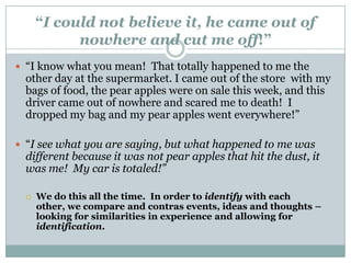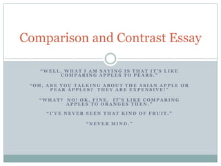 This document provides guidance on writing a comparison and contrast essay. It discusses using analogies to compare dissimilar things and making lists to outline similarities and differences between topics. Examples of potential comparison/contrast essay topics are given, such as comparing the same product from different stores or comparing friendships with different genders. Guiding questions are also provided to help select topics and focus the essay, such as considering the audience and determining whether similarities or differences are more important.