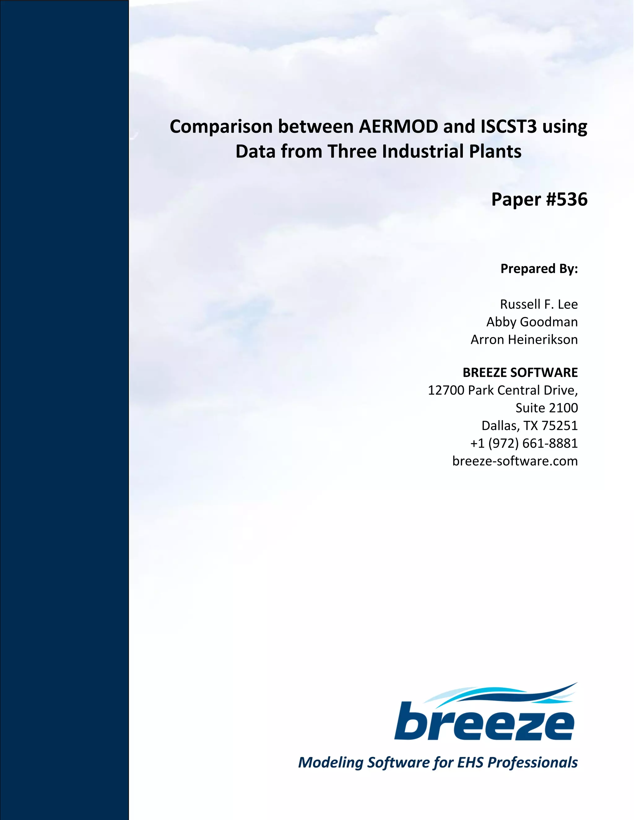 This document compares the air quality modeling software AERMOD and ISCST3 using data from three industrial sites: a refinery, a natural gas compressor station, and a portland cement plant. AERMOD, developed for regulatory use by the EPA and the AMS, may produce varying results compared to ISCST3, which depends on specific modeling scenarios and atmospheric conditions. The findings indicate that AERMOD can predict significantly different concentrations, with instances of values being notably higher or lower than those predicted by ISCST3.