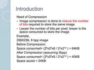 This document compares JPEG and JPEG 2000 image compression standards, highlighting the need for compression to reduce storage space and discussing various compression techniques like DCT and DWT. It details the advantages and disadvantages of each method, noting that DCT is utilized in JPEG for medium bit rates while DWT in JPEG 2000 offers better quality at lower bit rates but can introduce blurring. Ultimately, DWT avoids blocking artifacts seen in DCT but may have a lower quality at low compression rates.