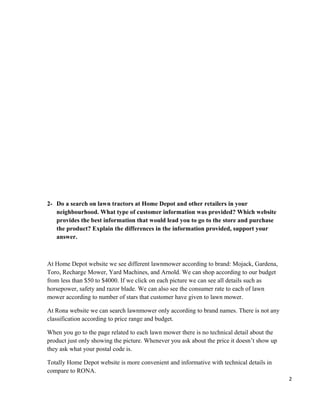 The document compares the websites of Home Depot and Rona for providing information to potential new suppliers. It finds that Home Depot's website provides more technical details and classifications of products than Rona's website. For lawnmowers specifically, Home Depot's website includes price ranges, consumer ratings, and technical specifications for each product, whereas Rona's website only lists brands and does not show prices or details without a postal code. Therefore, Home Depot's website provides better information for customers to purchase products.