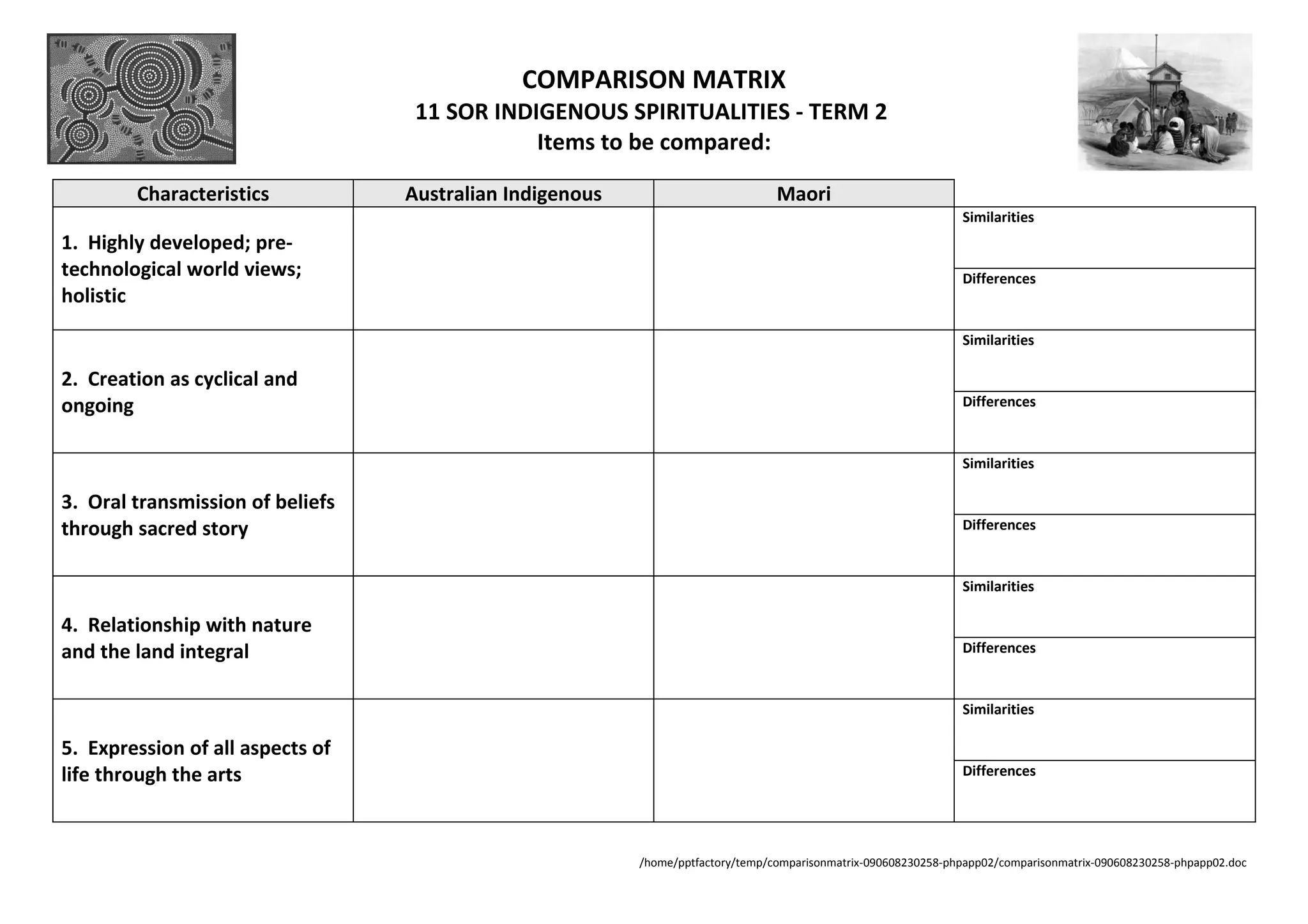 Australian indigenous and Maori spiritualities are compared based on five characteristics: they have highly developed pre-technological world views that see creation as ongoing and cyclical rather than linear; beliefs are transmitted orally through sacred stories rather than written texts; relationships with nature and the land are integral; and all aspects of life are expressed through the arts. Differences and similarities between the two spiritualities are noted for each characteristic.