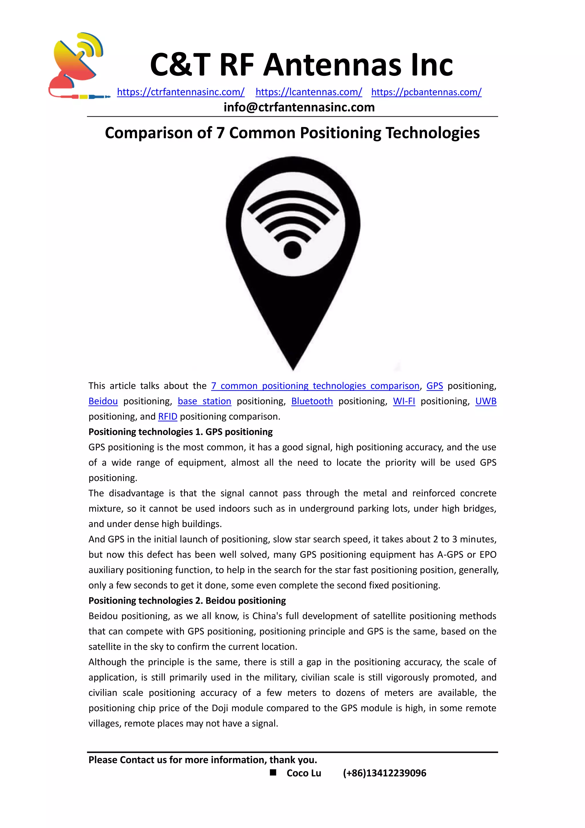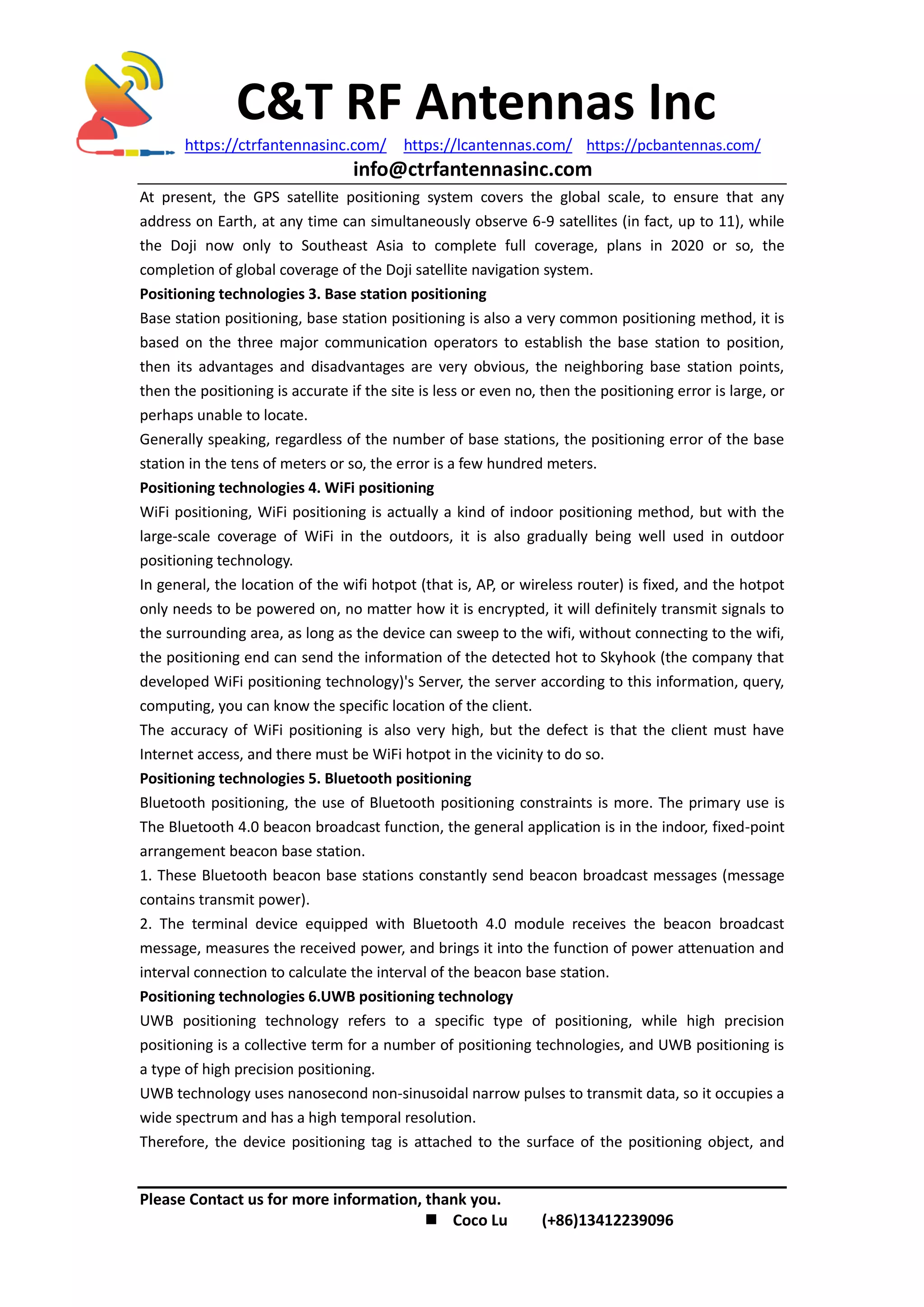 The document compares seven common positioning technologies: GPS, Beidou, base station, Wi-Fi, Bluetooth, UWB, and RFID, detailing their principles, accuracies, advantages, and limitations. GPS is noted for its widespread use and high accuracy, while Beidou is still developing civilian applications. Other methods like Wi-Fi and Bluetooth serve specific indoor positioning needs, and UWB offers high precision with low power consumption.