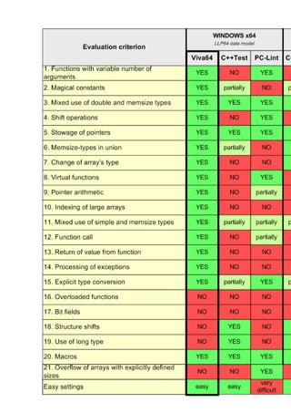 The document compares three static analyzers—viva64, Parasoft C++test, and Gimpel Software PC-lint—in terms of their capabilities for diagnosing 64-bit code errors during the porting of 32-bit C/C++ code. It details specific challenges and common errors encountered when adapting code for 64-bit systems, emphasizing the importance of using appropriate data models and types. The analysis is structured around evaluation criteria and provides insight into the advantages of the viva64 analyzer for 64-bit code verification.
