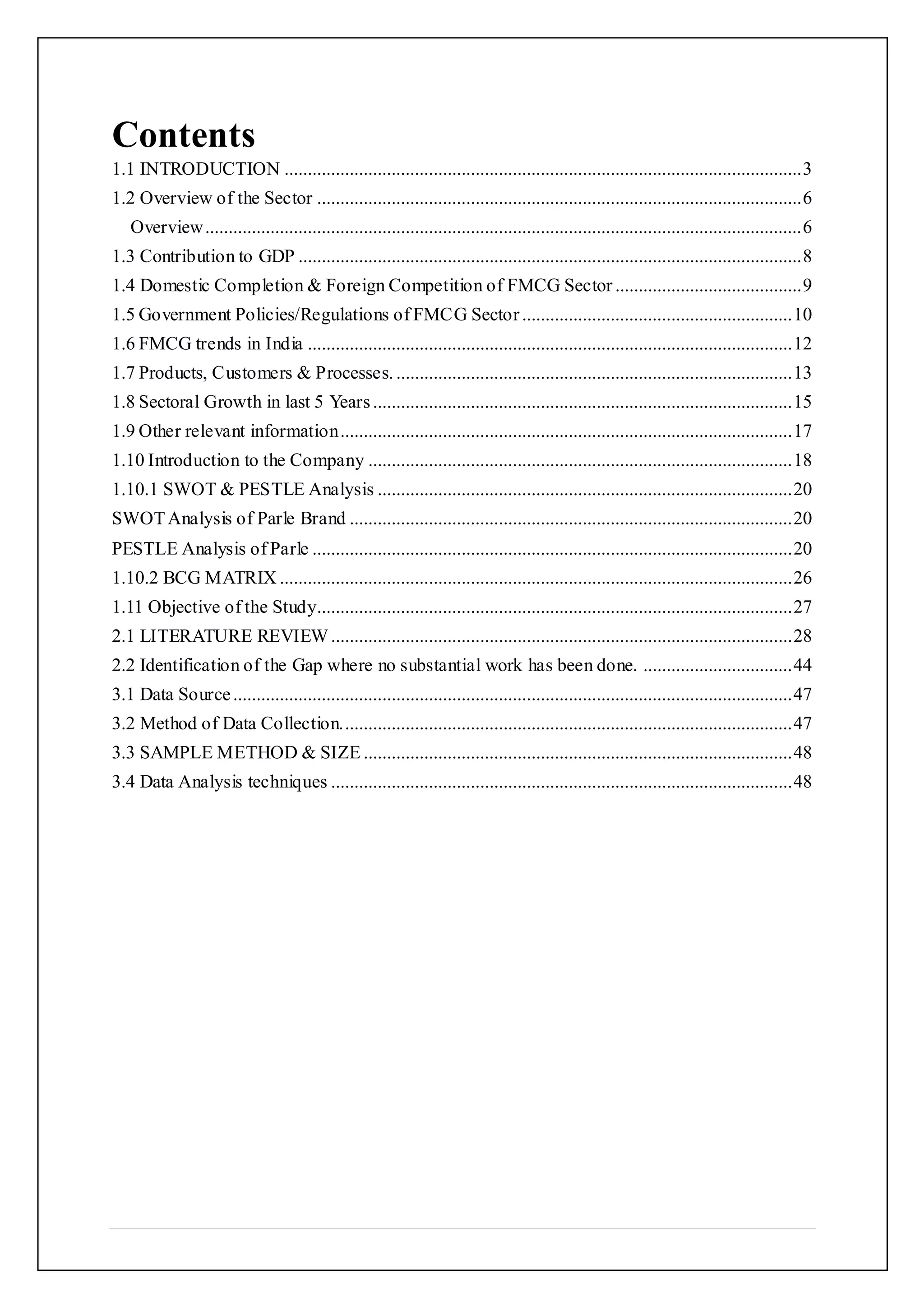 The document outlines a comprehensive analysis of consumer behavior towards two prominent FMCG brands, 'Parle' and 'Britannia'. It discusses the growth dynamics of the FMCG sector in India, key drivers of market expansion, government policies, and competitive landscape, while providing detailed insights into the domestic and foreign competition along with various analytical frameworks like SWOT, PESTLE, and BCG matrices. Additionally, it highlights the significance of rural markets, changes in consumer preferences, and the impact of government regulations on the sector's growth trajectory.