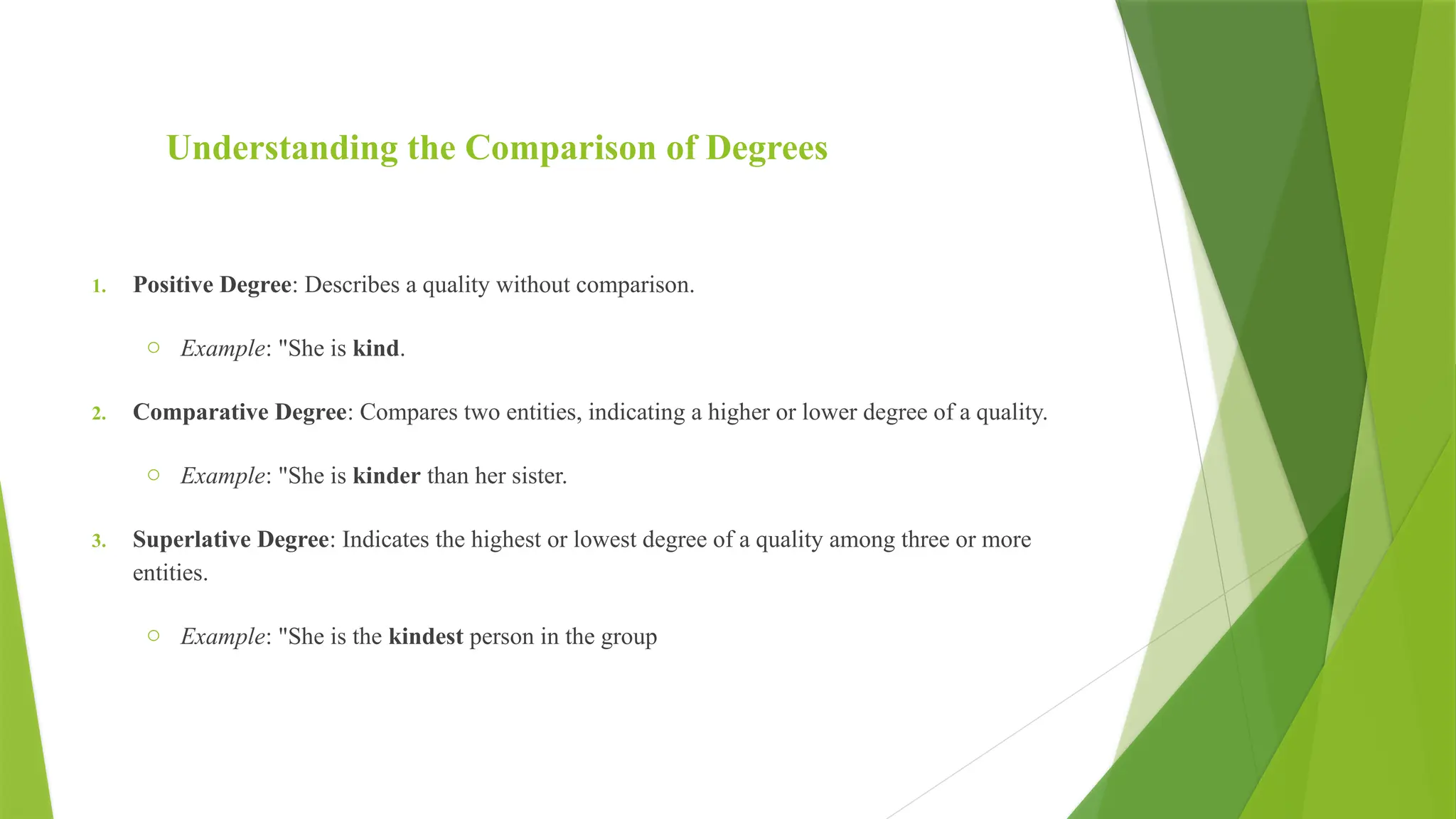 3. Superlative Degree: Indicates the highest or lowest degree of a quality among three or more