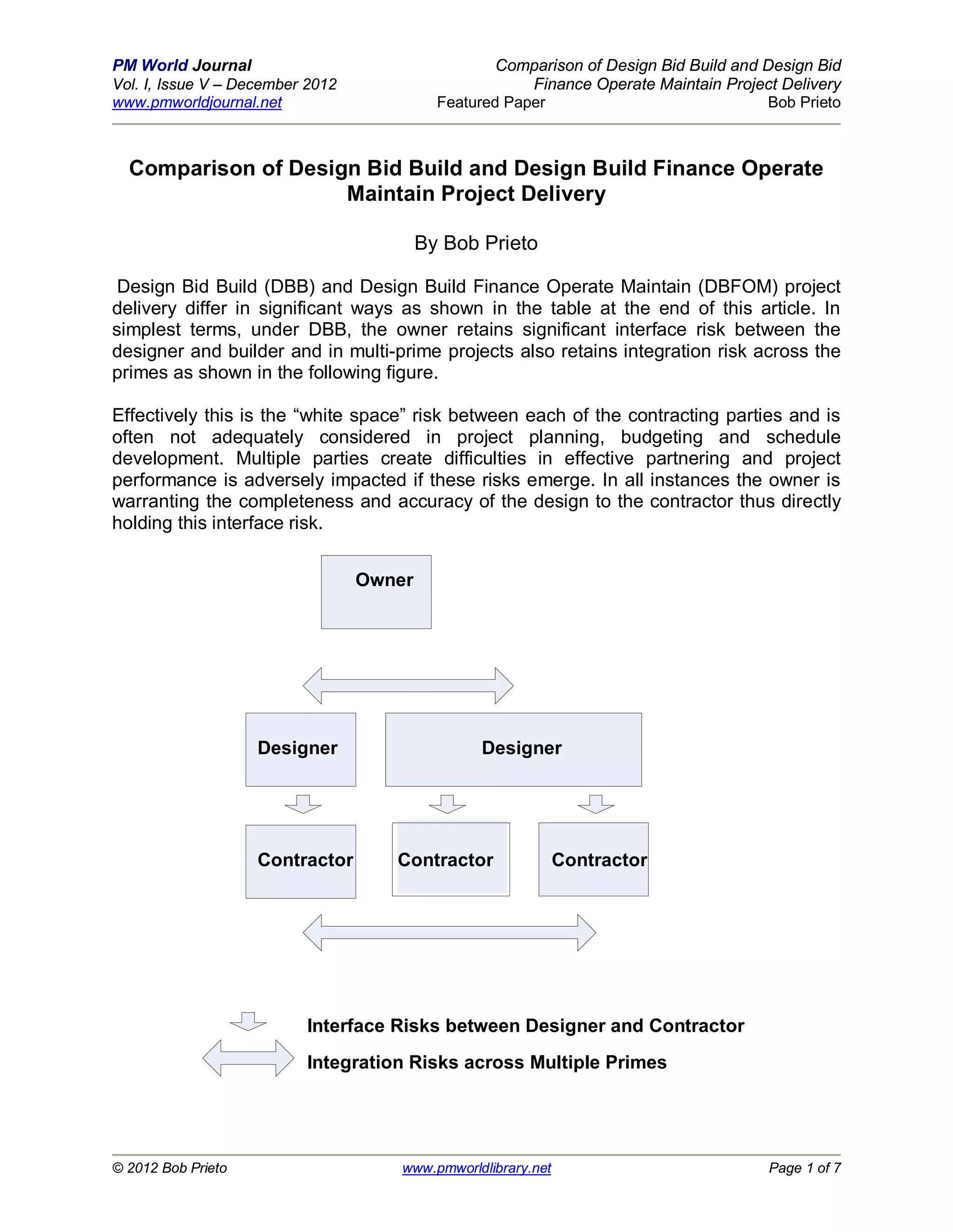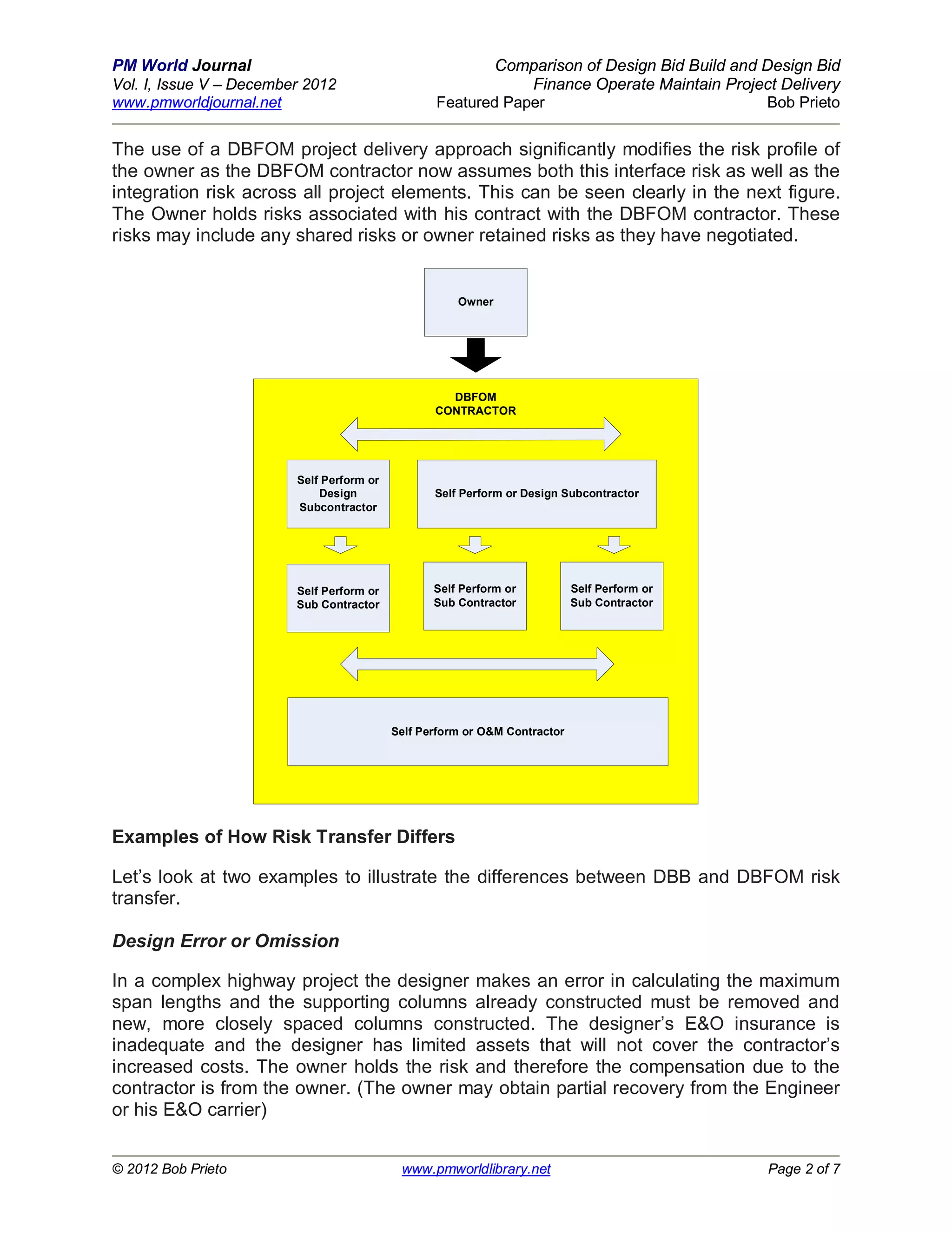The document compares the design bid build (DBB) and design build finance operate maintain (DBFOM) project delivery methods, highlighting the significant differences in risk management between the two. Under DBB, the owner retains interface and integration risks, while DBFOM transfers these risks to the contractor, thus altering the owner's risk profile. Examples illustrate how risks associated with design errors and scope definitions are managed differently in each approach, emphasizing the implications on project execution and ownership responsibilities.