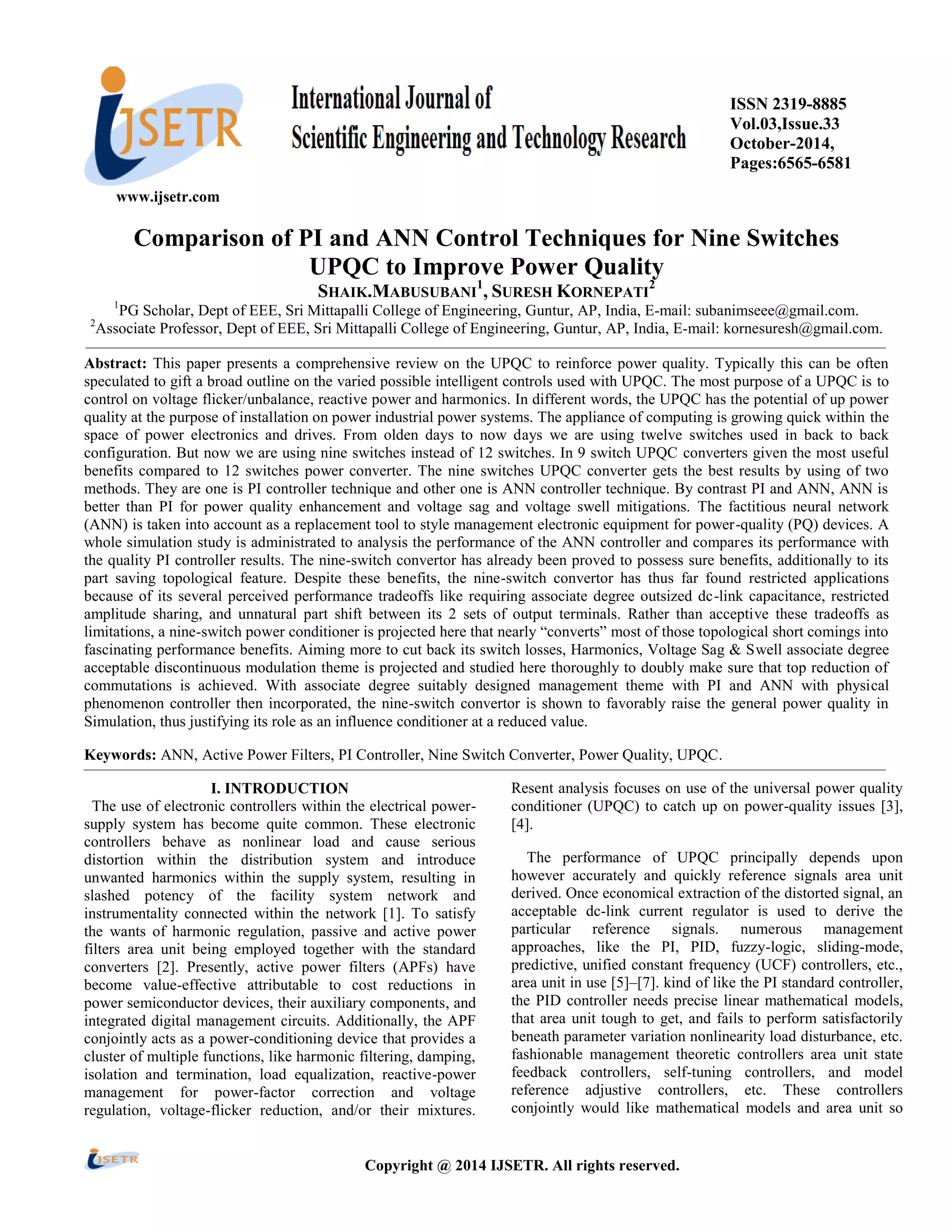 This paper compares the Proportional-Integral (PI) and Artificial Neural Network (ANN) control techniques for a nine-switch Unified Power Quality Conditioner (UPQC) aimed at enhancing power quality. The findings indicate that the ANN controller outperforms the PI controller in mitigating voltage sags and swells, despite the nine-switch converter's inherent limitations. The study includes simulation results supporting the effectiveness of the ANN control strategy in improving overall power quality at reduced costs.