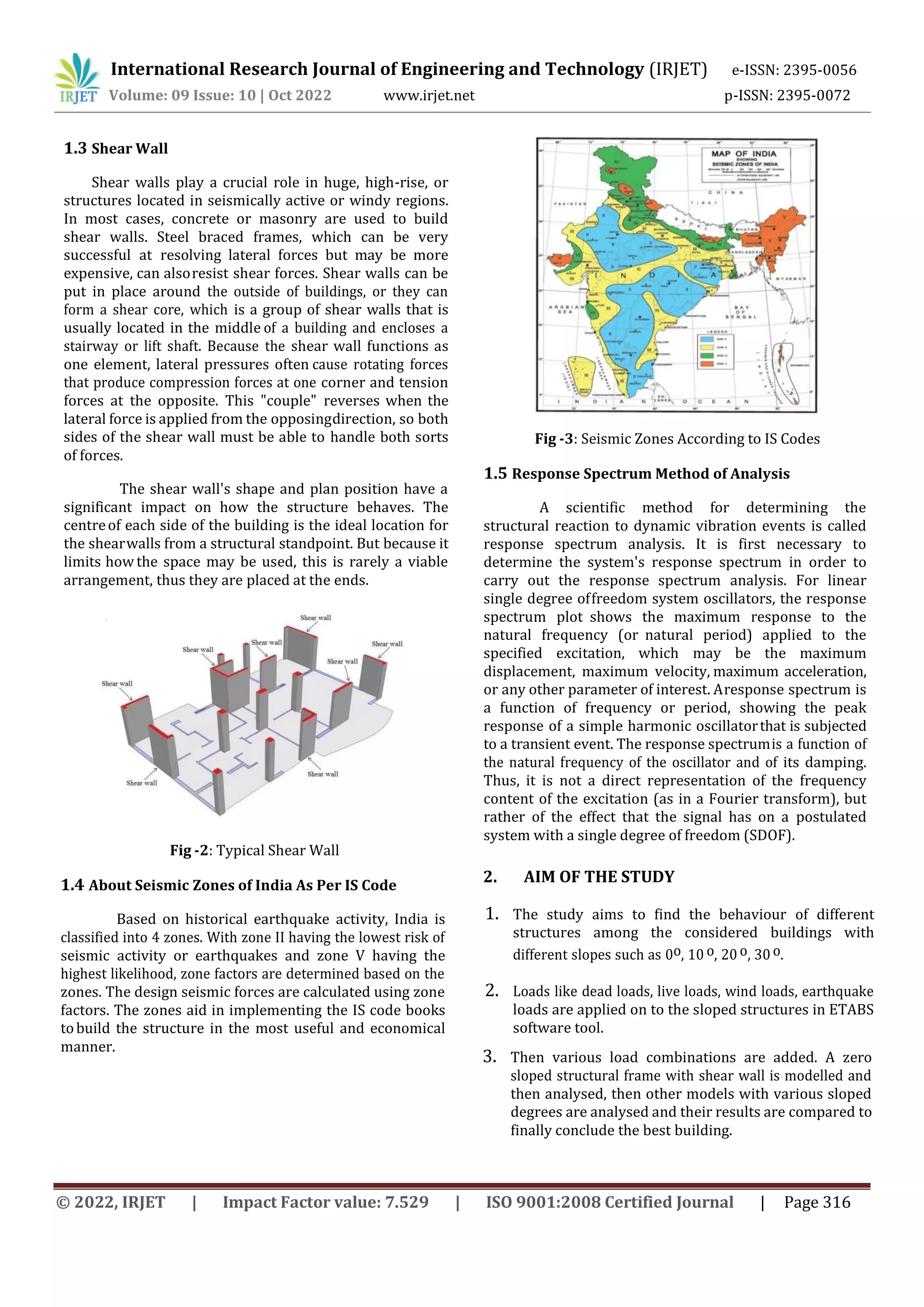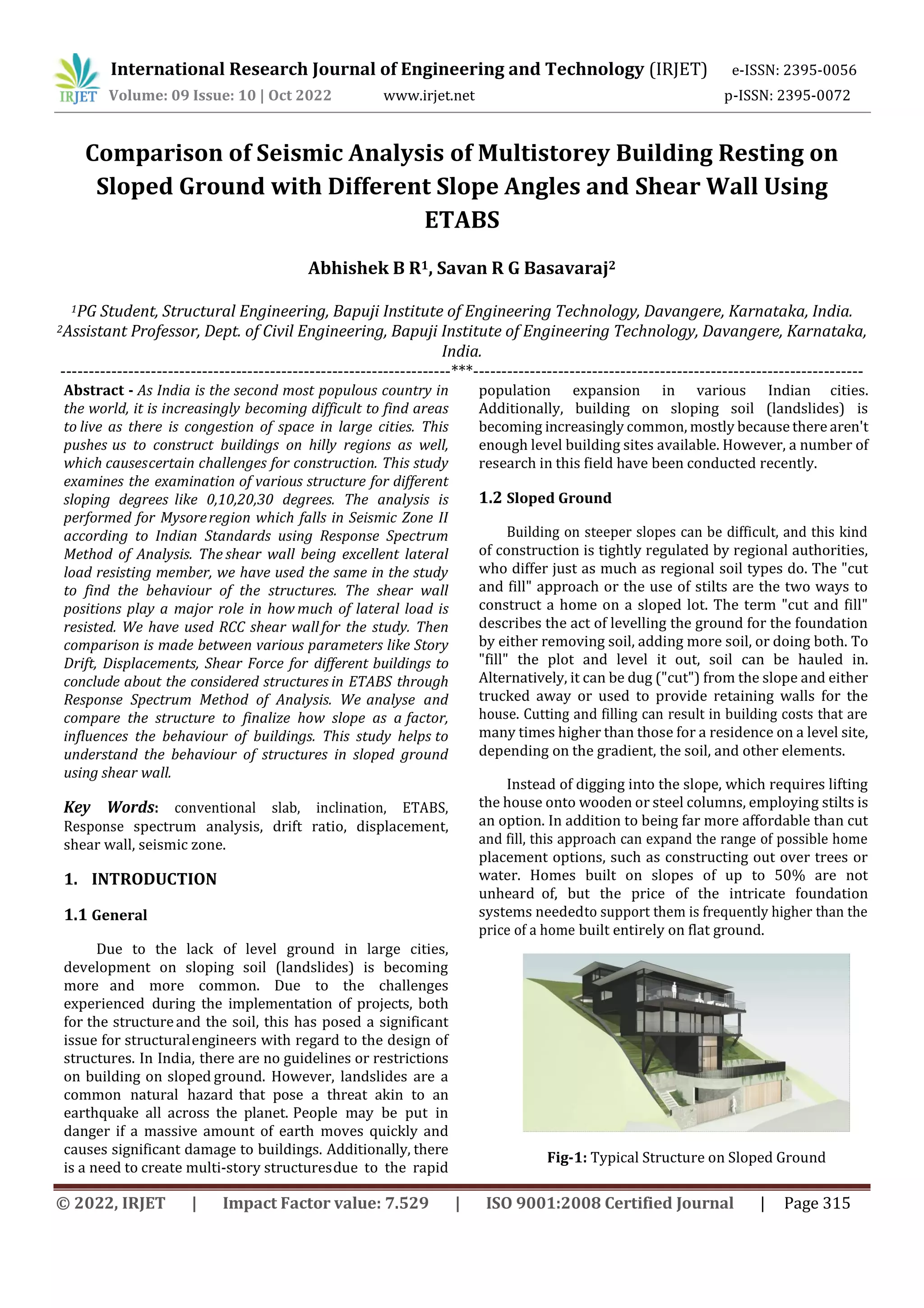 This document presents a comparison of seismic analysis of multistory buildings resting on sloped ground with different slope angles and shear walls using ETABS software. It models and analyzes reinforced concrete structures with slopes of 0, 10, 20, and 30 degrees considering factors like story drift, displacements, and shear forces. The study aims to understand how slope influences building behavior. It loads the structures, performs response spectrum analysis, and compares parameters. Results show the 0 degree slope structure has minimum displacement, drift, and shear values, indicating it performs best under earthquake loads. This research helps evaluate building performance on sloped sites.