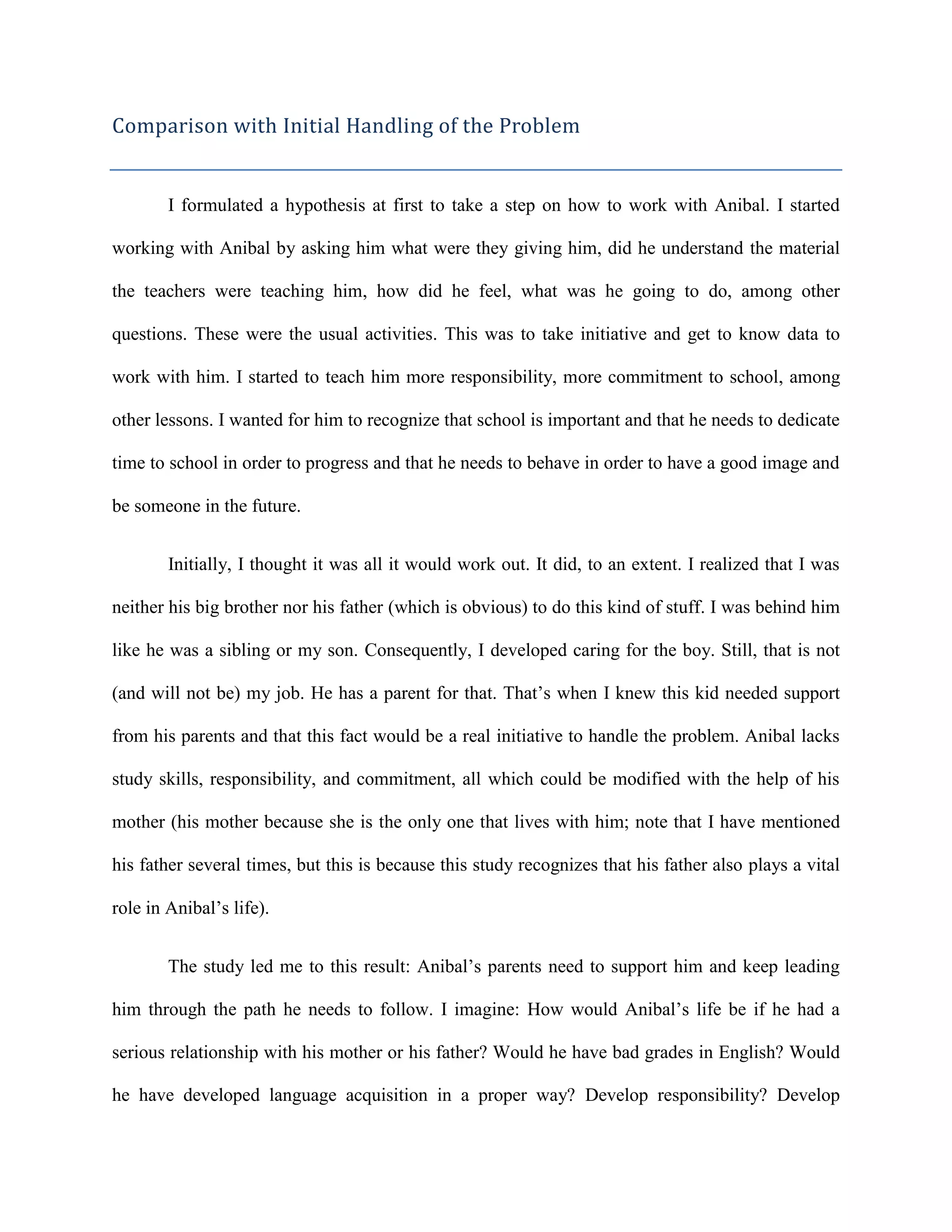 The document compares the initial handling of Anibal's problems to the realization that he needs more support from his parents. Initially, the author tried different communicative approaches to understand Anibal and help with his lack of study skills and responsibility. However, the author realized they were not Anibal's parent and he needed the long-term support that only his parents, especially his mother who lives with him, can provide. While teachers and tutors can help, Anibal spends more time with his family outside of the 5 hours he is in school each day.
