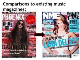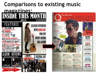 This document discusses comparisons between a new music magazine and existing music magazines. It focuses on evaluating how a new magazine compares to others currently available. In a few short sentences, it introduces the topic of comparing features of different music periodicals.