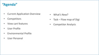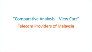 The document compares view cart features across four major telecom providers in Malaysia: Celcom, Maxis, U Mobile, and Digi. It analyzes each provider's ability to handle multiple items and plans in the cart, edit items, save and retrieve carts. Screenshots are included of the view cart functionality for Celcom, Maxis, and U Mobile. A graph compares the four providers based on their view cart features.