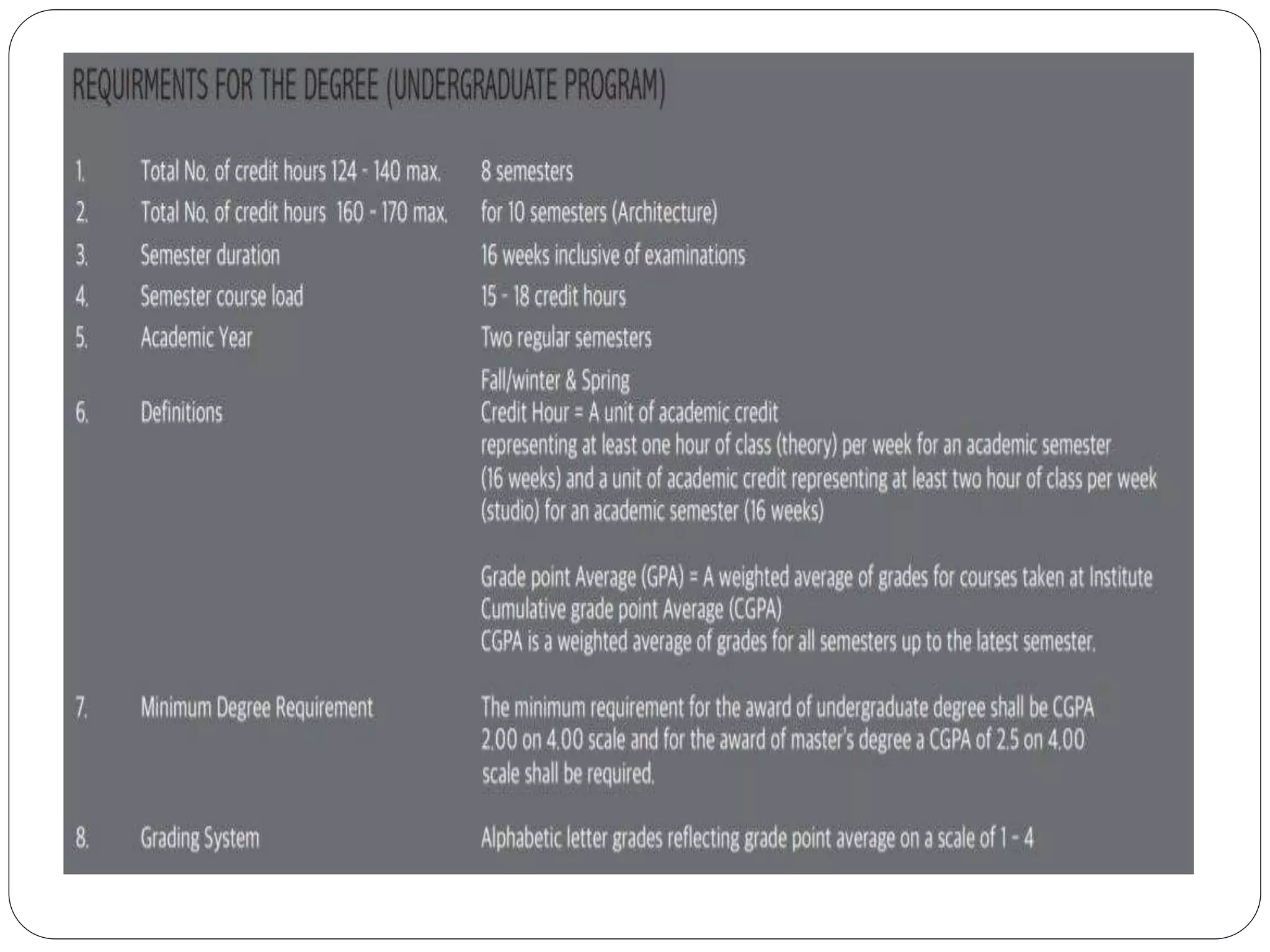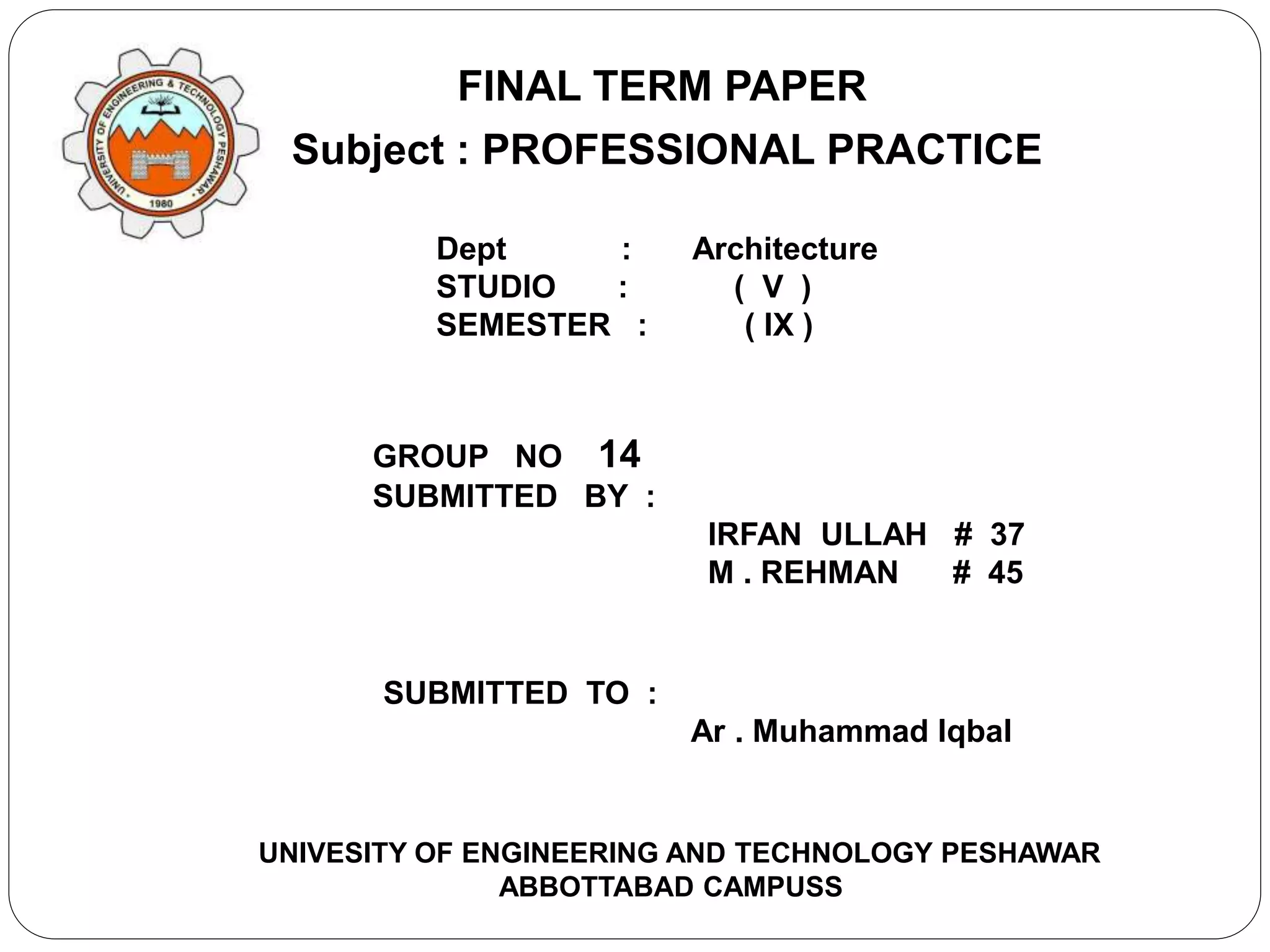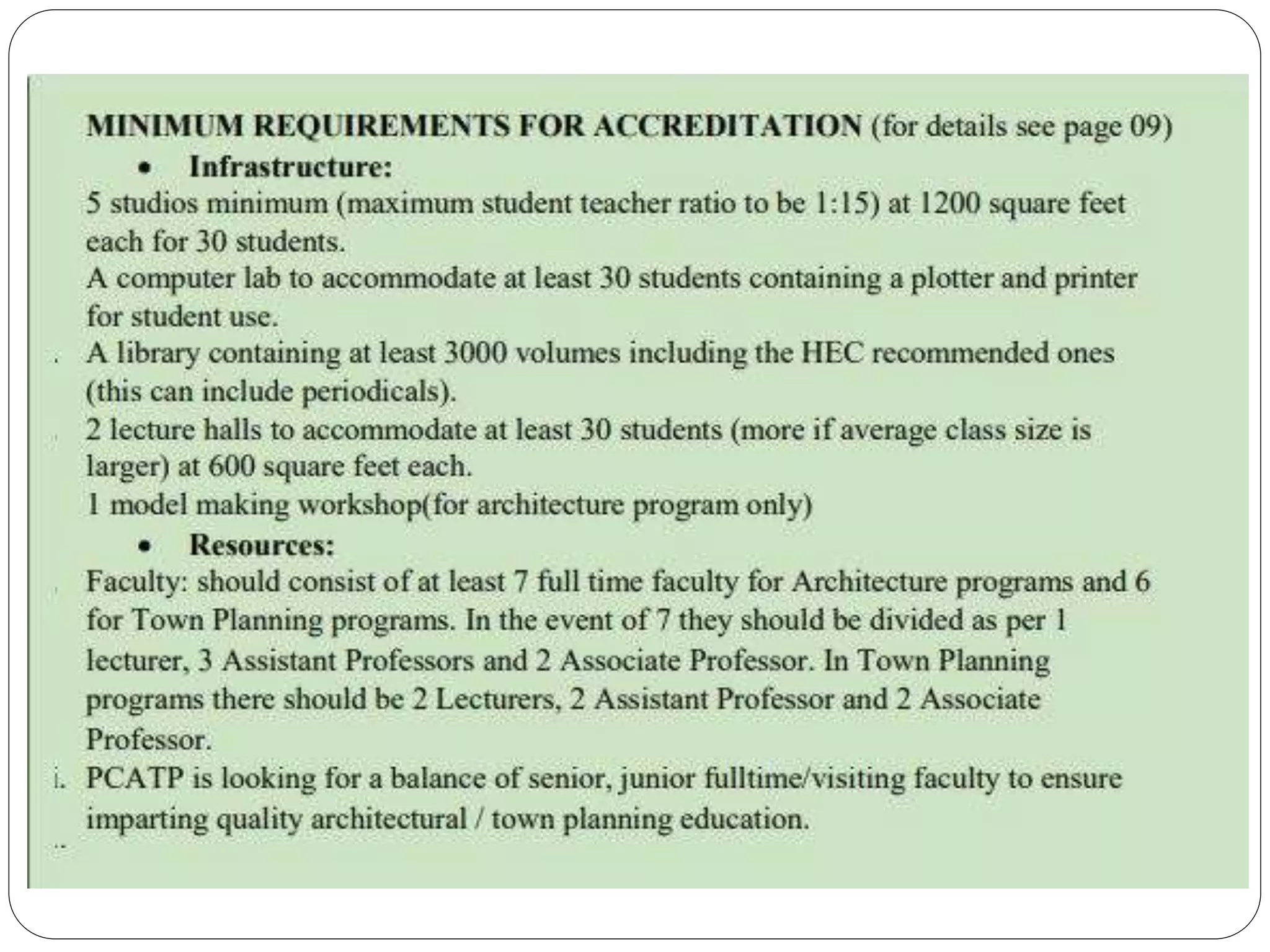 The document provides information on the accreditation processes of different architecture institutions including the Pakistan Council of Architects and Town Planners (PCATP), Indian Institute of Architects (IIA), and Royal Institute of British Architects (RIBA).