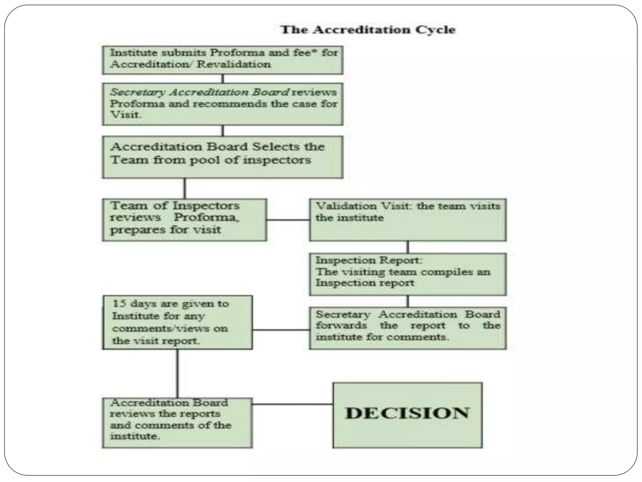The document then provides details on the multi-step validation and accreditation process used by