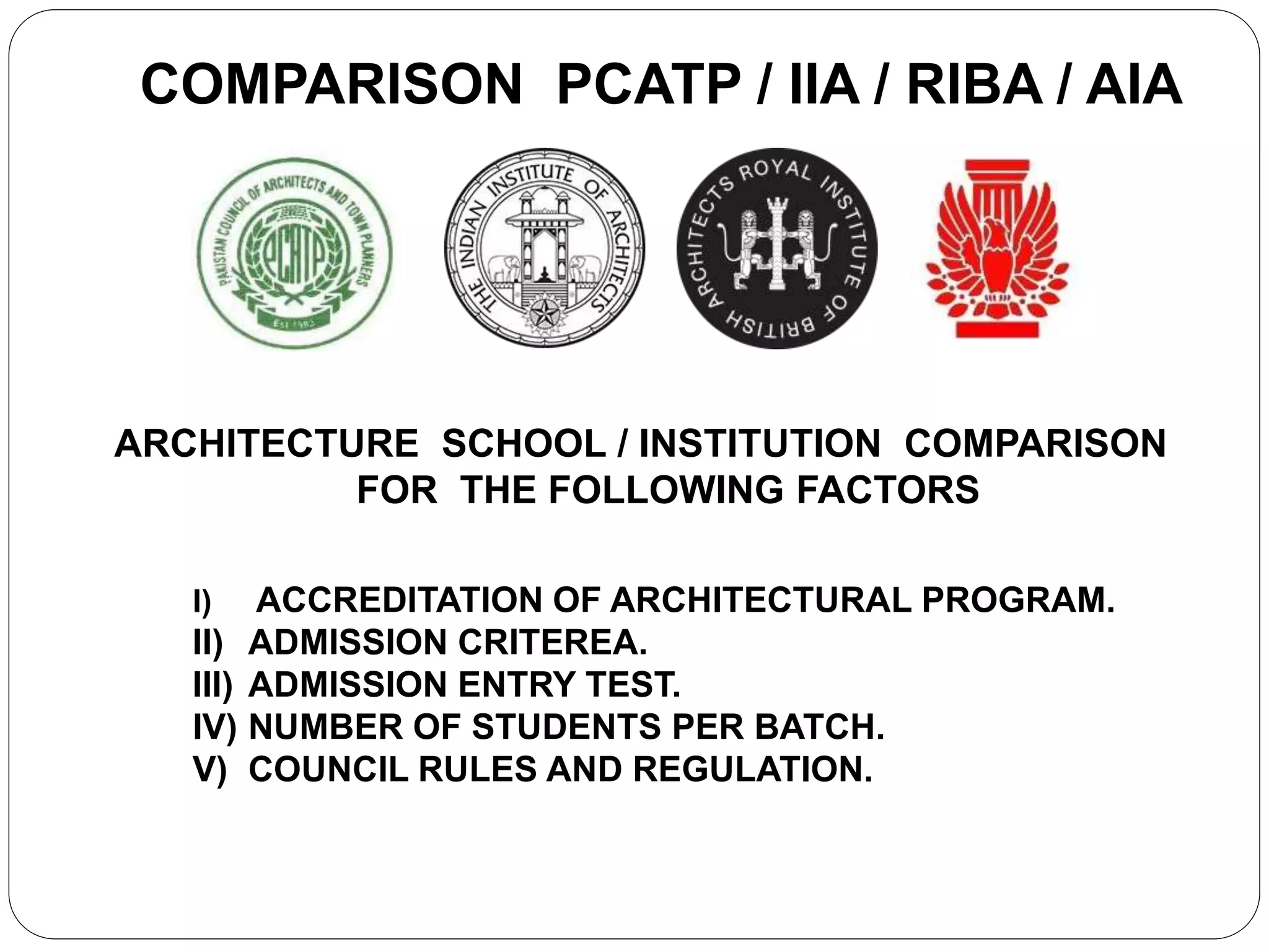 It compares the accreditation criteria and requirements between PCATP, IIA, and RIBA/NAAB. It outlines the accreditation parameters and processes used by PCATP which includes zero visits, interim visits, and revalidation. It also discusses the admission criteria, syllabus, and student to teacher ratios of programs accredited by IIA.