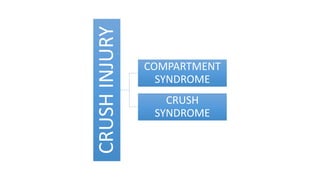 - Crush injury syndrome, also known as compartment syndrome, occurs when increased pressure within an osteofascial compartment reduces blood flow, resulting in tissue damage.