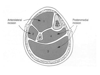 Compartment syndrome occurs when increased pressure within a closed osteofascial space compromises blood flow to muscles and nerves. It is most commonly caused by fractures that increase swelling. The diagnosis is based on pain disproportionate to the injury that worsens with passive stretching. While signs like pallor, paralysis and pulselessness occur late, an early fasciotomy is the definitive treatment to prevent permanent damage. Locations prone to compartment syndrome include the lower leg, forearm, thigh and foot.