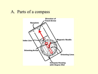 1) A compass is used to determine bearings to navigate from one point to another. The direction of travel arrow points towards the destination and the red end of the needle points to north.