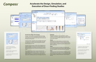 Compass is Cytel's software for designing, simulating, and executing early phase clinical trials to identify the optimal dose. It offers both Bayesian and frequentist adaptive design methods and allows customization using R code. Compass simplifies study design and simulation. It provides visualization tools to evaluate designs and communicate trial plans. For dose-finding trials, Compass performs interim analyses, updates dose allocations, and includes a dashboard and log file for monitoring the trial.