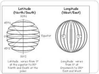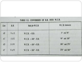 The document discusses various topics related to surveying including chain surveying, compass surveying, traversing, prismatic compasses, bearings, latitude and longitude, and compass adjustments. It provides information on when different surveying methods are recommended based on terrain and area size. It also defines key terms like meridians, bearings, declination, inclination, and different bearing systems. Examples are given for calculating bearings and adjusting for magnetic attraction. Adjustments discussed for prismatic compasses include centering, leveling, and focusing the prism.