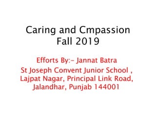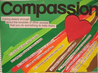This document discusses compassion and caring. It defines compassion as caring enough about others' troubles to help them. It then lists the letters in "COMPASSION" and provides a short definition for each letter related to showing compassion for others, such as making time to listen, smiling when others need it, and offering help. The document also provides examples of showing compassion through acts like participating in food drives, donating food, and helping others in need. It then discusses how caring is important for friendship, sharing, and getting closer to others, and suggests helping friends with problems to show caring.