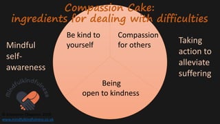 This document provides ingredients for dealing with difficulties which include being kind to yourself, having compassion for others, and being open to kindness. It also recommends cultivating mindful self-awareness and taking action to alleviate suffering. The overall message is about practicing compassion.