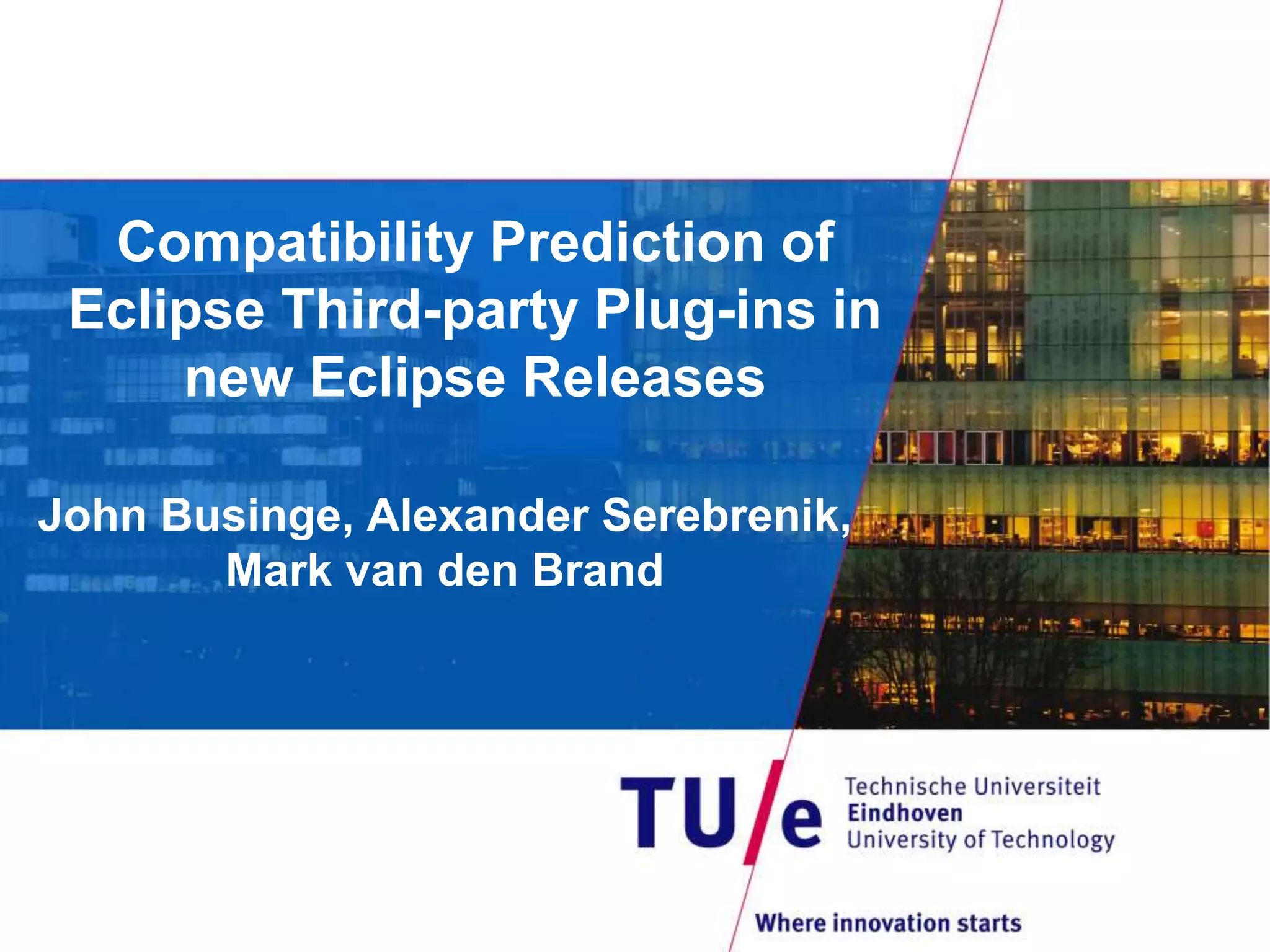This document discusses a study on predicting the compatibility of Eclipse third-party plugins (ETPs) with new Eclipse releases. The researchers built prediction models using logistic regression based on ETPs' usage of Eclipse APIs versus non-APIs. They trained and tested 36 models and found high accuracy, precision, and recall over 80% in many cases. The models show promise for predicting compatibility and could be developed into a tool to help ETP users and developers.