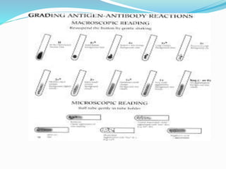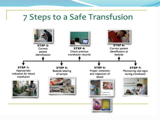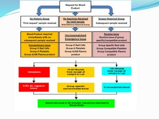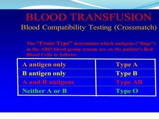 The document discusses the steps for compatibility testing prior to blood transfusion, which includes correctly identifying the donor and recipient, testing their blood samples, and performing a cross-match. It aims to detect any errors in grouping, labeling, or identification and to find any antibodies in the recipient's serum that could react with donor antigens to prevent adverse reactions.