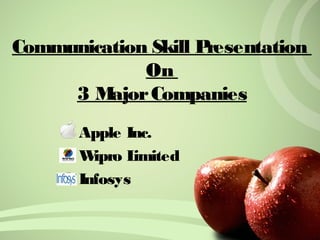 This document provides information on three major companies - Apple Inc., Wipro Limited, and Infosys. It discusses their types, industries, key founders and people, services, revenues, employees, and other details. Apple is an American company known for products like the iPhone, iPad and Mac computers. Wipro is an Indian IT services company with over 115,000 employees. Infosys is also an Indian IT company founded in 1981 with over 122,000 employees providing consulting and outsourcing services.