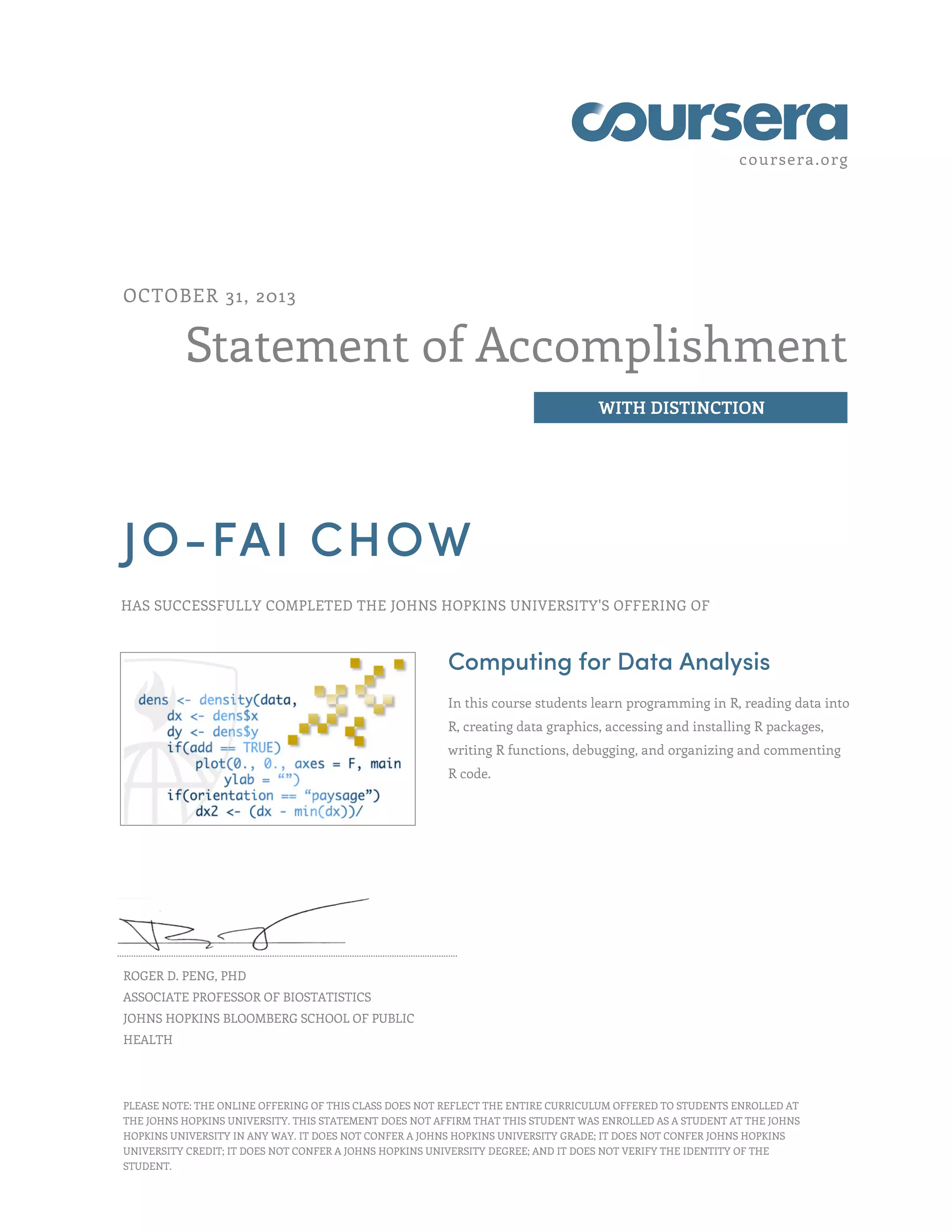 Jo-Fai Chow successfully completed the Coursera course "Computing for Data Analysis" from Johns Hopkins University with distinction. The course taught programming in R, including reading data into R, creating graphics, using packages, writing functions, debugging code, and commenting code. The course was taught by Roger D. Peng from the Johns Hopkins Bloomberg School of Public Health.